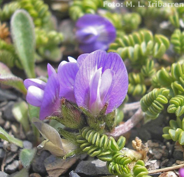 Perenne, baja, con raíces adventicias. Tallos decumbentes de 2-6 cm alt., los más de¬sarrollados de 14-24 cm alt., llegando a formar matas densas. Hojas de 1,5-2,5 (4) cm, 5-6-(8-)yugadas con impar; estípulas de (2) 2,5-3 (6) cm, amplexicaules, membranáceas, bidentadas, glabras, ciliadas, marcescentes; folíolos de 2-4 (7) x 1,5-3 (5) mm, condupli¬cados, obcordados a cuneiformes. Pedúnculos de (0,5) 1,5-6 cm, (3-)4-7-(8-)floros. Flo¬res en racimo capituliforme, brácteas de 1,5-3 mm, ciliadas, bractéolas de 0,5-1 mm, triangular-subuladas. Cáliz de 4-4,5 (5) mm, generalmente negro-pubescente. Vexilo de 6,5-7,5 (10) x (3,5) 5-7 mm, azul-violáceo, subcircular, entero o emarginado; alas de 6,5-9 mm, elípticas, planas o plegadas por su nervio principal, quilla de 5-5,5 (7) mm. Ova¬rio blanco-pubescente, 9-10-(ll-)ovulado. Legumbre de (0,9) 1,2-1,4 (1,75) x 0,6-0,8 cm, 1-locular, papirácea e inflada, elipsoide, fusiforme a ligeramente ovoide, aguzada, comprimida dorsiventralmente, en trascorte elíptica, negro-pubescente o excepcional-mente incana, superficie interna lisa, con 9-10 semillas.