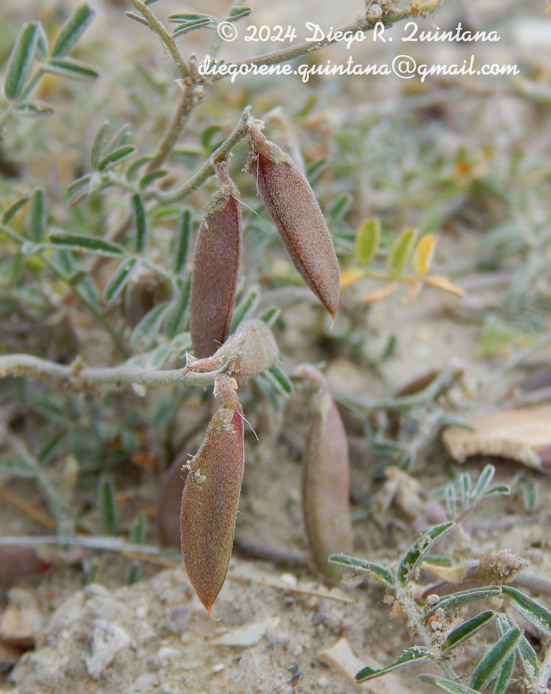 Hierba perenne. Tallos de 6,5-18 cm alt., decumbentes, ramosos desde la base, pu-bérulos. Hojas de 3,5-5 cm, (2-)3-5-yugadas con impar; estípulas de 1,5-3 mm, ample¬xicaules, membranáceas, angostas, bidentadas, generalmente unidas hasta la mitad, cilia¬das, pubérulas; folíolos de 4,5-16 x 1-2 mm, generalmente dispuestos en la mitad supe¬rior del raquis, planos, linear-oblongos, romos a emarginados. Pedúnculos de 5-10 cm, con 2-7 flores en racimos muy laxos; brácteas de 1-2 mm, bractéolas de 0,5 mm, ambas trian-gular-subuladas. Flores celeste-violáceas, pequeñas. Cáliz de 2,5-3,5 mm, pubescente; vexilo de 7,5-8 x 4-7 mm, anchamente elíptico; alas de 6,5-8 x 1,5-2 mm, oblongas, borde superior de la lámina escotado en su tercio inferior; quilla de 5-6 mm. Ovario pubéru-lo a glabro. Legumbre de 1,5 cm x 4 mm, subbilocular, papirácea, reflexa, linear, fuerte¬mente comprimida lateralmente, trascorte triangular, mucronulada, sutura placentar fili¬forme, la dorsal fuertemente invaginada, seguida de un reborde membranáceo forman¬do un falso semitabique de ca. 2 mm, cuando inmaturas pardo-oscuras, glabrescentes a glabras, al madurar pardo-amarillentas y glabras; semillas numerosas.