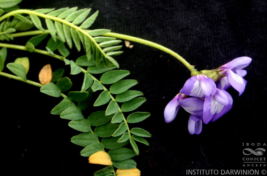 Hierba glabra de tallos delgados, ascendentes de 6-10(-12) cm long.,. Hojas de 2-3(-4) cm long.; estípulas de 2,5-5 mm long.; pecíolo de 1-2(-2,5) mm long., con 7-8(-9) pares de folíolos de (3-) 4-6 mm long. x 1,5-2,5 mm lat, ovado- elípticos, ápice emarginado a truncado, con pocos pelos generalmente en los margenes y nervadura central., .; Inflorescencia con pedúnculos de 2-2,5 cm long.; 3-4 floros; pedicelos de 1-2 mm long. Flores, azul-violáceas, caliz de 4-5 mm long., estandarte ovado de 8-10 mm long. x 5-6,5 mm lat. alas espatuladas, MEDIDAS? quilla de 5,5-6 mm long.; ovario pubescente con 6-8-ovulado . Fruto legumbre, estrigosa de 7-10 mm long. x 2,5-3,5 mm lat, subilocular con borde inflexo seguido de reborde membranoso, corte transversal triangular (40????). Semillas ca. 6.