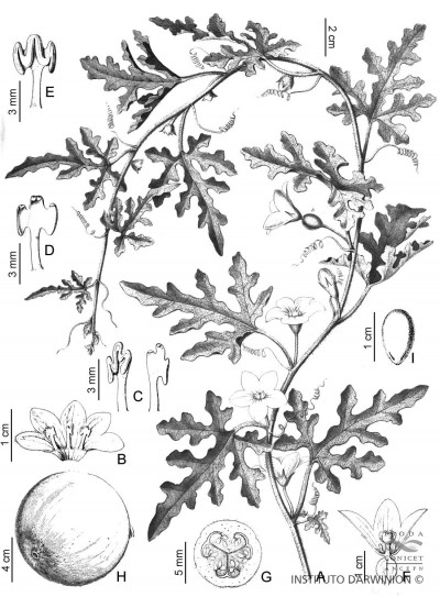 Hemicriptófitos; vástagos hirsutos. Hojas profundamente 3- 5-palmatipartidas, con pecíolos de 0,8-6 cm de largo y láminas de 2,6-11 cm de largo, con lóbulos pinnatífidos. Zarcillos simples, raro 2-fidos. Probráctea elíptica, de 4-5 mm, caduca. Flores estaminadas con pedicelos de 8-20 mm de largo; hipanto de 1,5- 2,5 mm de largo; sépalos lanceolados, de 2-4 mm de largo; pétalos de 8-9 × 5 mm. Flores carpeladas con pedicelos de 10-45 mm de largo; ovario de 7-9 × 5-8 mm, hirsuto; sépalos de 3-5 mm de largo; pétalos de 6-10 × 4-6 mm. Pepónides subesféricos de 5-12 cm de diámetro, de aspecto similar al de una naranja, amarillento, con surcos longitudinales poco pronunciados; pericarpio muy duro y pulpa amarga. Semillas 6,5-10 × 3,5-5 × 2-2,5 mm, pardas.