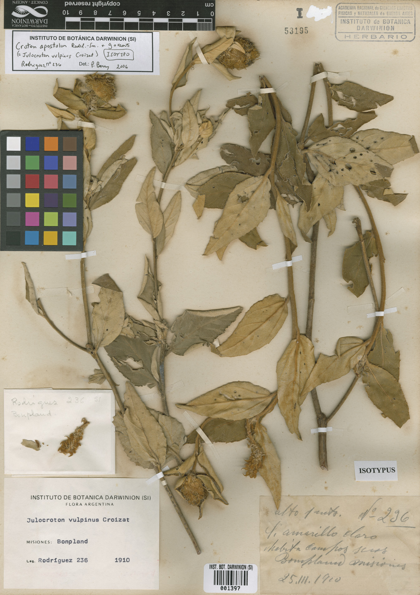 Observaciones: Croton apostolon pertenece a Croton secc. Julocroton (Van Ee et al., 2011). El epíteto original (“vulpinus”) deriva del latín parecido a un zorro, y se refiere probablemente a la pubescencia suave y rojiza típica de la cara abaxial de las láminas foliares e inflorescencias. El epíteto “apostolon” refiere al departamento Apóstoles al sur de la provincia de Misiones donde el tipo fue coleccionado. Posiblemente Croton cooperianus (Croizat) Radcl.-Sm. & Govaerts, de Paraguay, sea conespecífica con C. apostolon, ya que ambas comparten las inflorescencias tipicamente cubiertas por tricomas dorados.