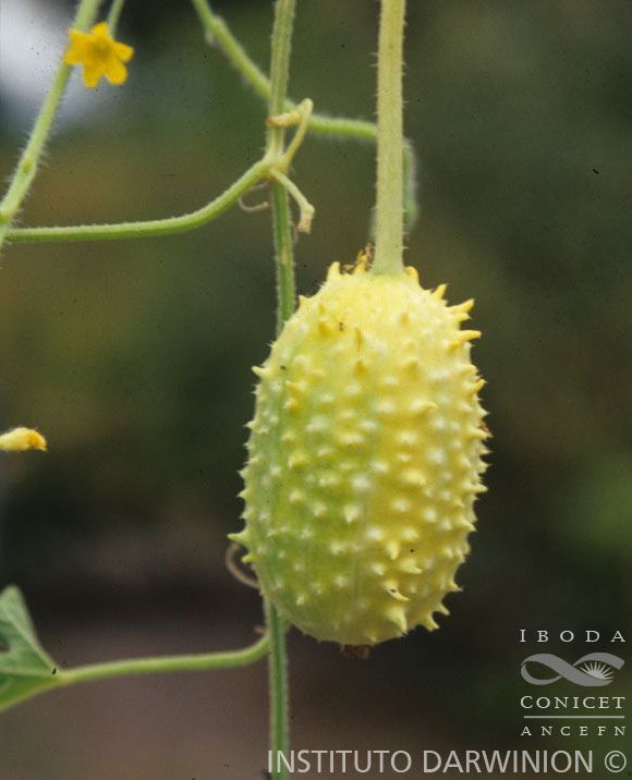Gracias a Meeuse (1958) se sabe que esta especie, considerada como la única americana del género (Millán, 1968) o al menos con un origen dudoso, es en realidad un linaje seleccionado por cultivo de Cucumis longipes Hook. fil., introducido en América un poco antes de 1650, a través del tráfico de esclavos. Se trata de una especie frecuente en las regiones cálidas y secas de América. En Argentina se la encuentra en las Provincias Biogeográficas Prepuneña, Chaqueña, del Monte, Pampeana y del Espinal (Jujuy, Salta, Chaco, Formosa, Corrientes, Mendoza, San Luis, La Pampa, Buenos Aires). En las provincias de Chaco y La Pampa se comporta como una maleza (Martínez Crovetto, 1968; Covas, 1972).