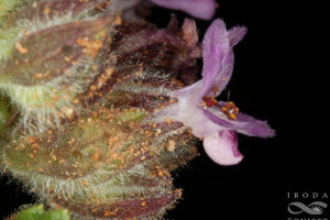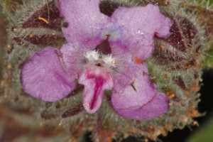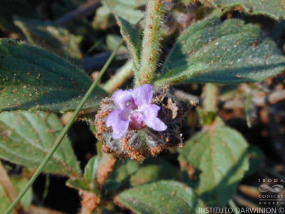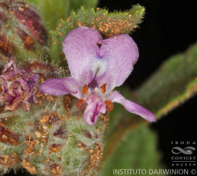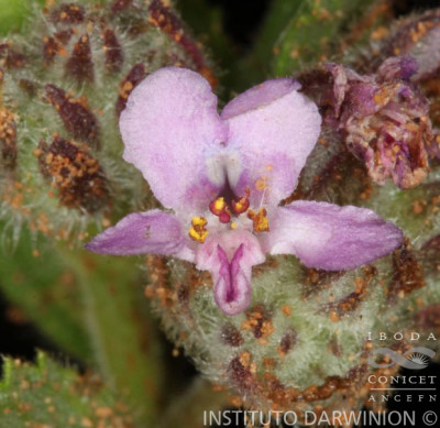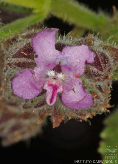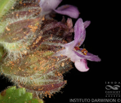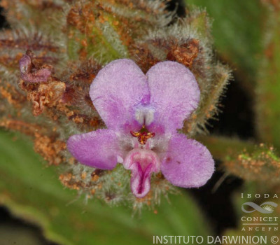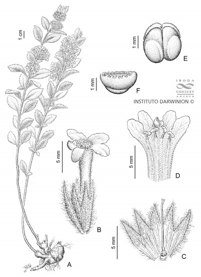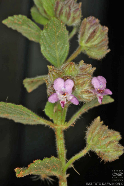 Hierbas perennes, erectas, base leñosa, hasta de 50 cm de alto; ramas decumbentes en la base, luego ascendentes, densamente villosas, con pelos simples multiseriados. Hojas con pecíolo de 0,4-0,9 cm de largo; lámina elíptica u obovada, de 0,6-2,2 × 1 cm, base decurrente, ápice obtuso, margen serrado en la mitad superior, densamente villosa en ambas caras. Capítulos hemiesféricos de 1-2 cm de diámetro; brácteas florales angostamente elípticas, de 0,4-1 cm de largo. Cáliz de 0,6-0,8 cm de largo, de 0,7-12 cm en fructificación, membranáceo, externamente piloso, internamente sólo en el borde de los dientes, dientes subiguales, deltoideos, conniventes en el fruto; corola lila a violácea, tubo de 1-1,7 cm de largo, lóbulo medio del labio inferior más pequeño y levemente acucharado. Clusas de 2-3 mm de largo.