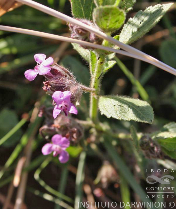 Hierbas perennes, erectas, base leñosa, hasta de 50 cm de alto; ramas decumbentes en la base, luego ascendentes, densamente villosas, con pelos simples multiseriados. Hojas con pecíolo de 0,4-0,9 cm de largo; lámina elíptica u obovada, de 0,6-2,2 × 1 cm, base decurrente, ápice obtuso, margen serrado en la mitad superior, densamente villosa en ambas caras. Capítulos hemiesféricos de 1-2 cm de diámetro; brácteas florales angostamente elípticas, de 0,4-1 cm de largo. Cáliz de 0,6-0,8 cm de largo, de 0,7-12 cm en fructificación, membranáceo, externamente piloso, internamente sólo en el borde de los dientes, dientes subiguales, deltoideos, conniventes en el fruto; corola lila a violácea, tubo de 1-1,7 cm de largo, lóbulo medio del labio inferior más pequeño y levemente acucharado. Clusas de 2-3 mm de largo.