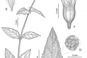Hierbas perennes hasta de 1,5 m de alto; tallos pilosos, con pelos adpresos. Hojas pecioladas; pecíolos de 0,5-4 cm de largo; láminas elípticas a angostamente ovadas, de 3-15 × 2-4 cm, base aguda atenuada, ápice agudo, margen irregularmente aserrado, pubescencia de pelos laxos y largos, muchas veces multiseriados, dispuestos más densamente sobre las nervaduras de la cara abaxial y también sobre el resto de la superficie, de manera desordenada. Capítulos globosos, de 1-1,5 cm de diámetro, multifloros, solitarios en la axila de las hojas superiores; pedúnculos de 1-3 cm de largo, con pelos adpresos; bractéolas involucrales ovadas, de 8-10 mm de largo, acuminadas, estrigosas, margen ciliado. Flores subsésiles, con pubescencia de pelos muy largos en la base, naciendo del receptáculo; cáliz florífero de 4-5 mm de largo, acrescente hasta de 7 mm en el fruto, el exterior ligeramente estrigoso, con pelos glandulares sésiles entremezclados, internamente el cáliz es glabro, dientes del cáliz triangulares, ca. 2 mm de largo, largamente aristados, margen ciliado; corola rosada o blanca, de 5-10 mm de largo. Clusas ovoides, de 1-1,5 mm de largo, castaño-oscuras, glabras.