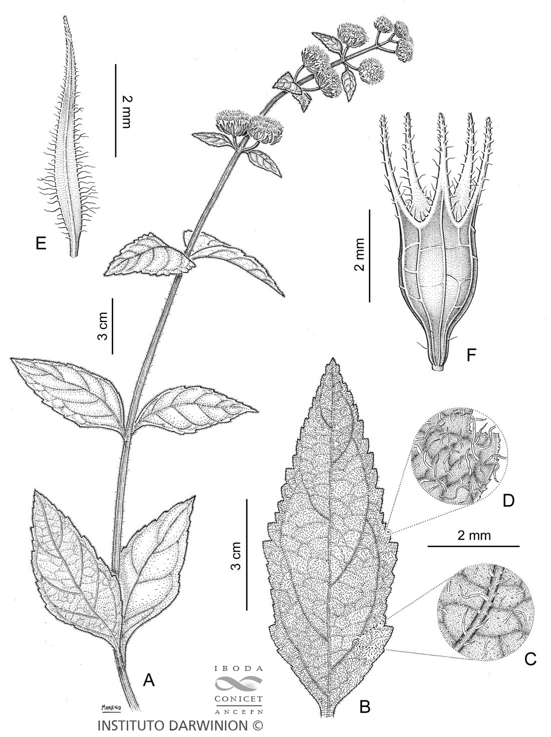A. Rama con inflorescencia. B. Hoja, cara adaxial. C. Hoja, detalle de la pubescencia de la cara abaxial. D. Hoja, detalle de la pubescencia de la cara adaxial. E. Bractéola. F. Cáliz.