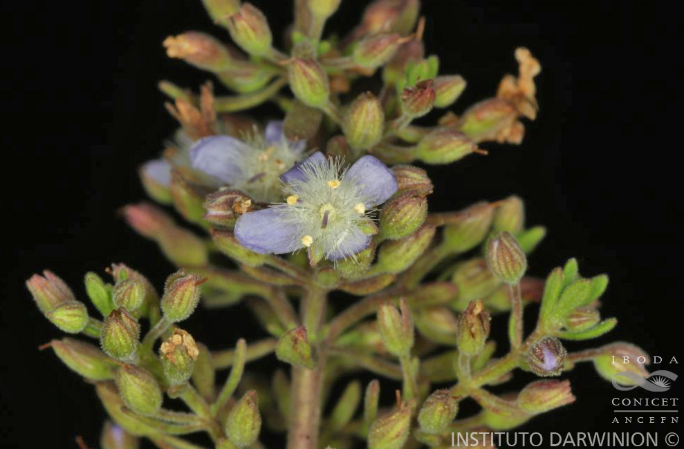 Hierbas perennes o subarbustos, erectos, hasta de 30 cm de alto, muy ramificados, hirsutos. Raíz leñosa, ramificada, gruesa, axonomorfa. Tallos subcuadrangulares, aristados, erectos en la base, rugosos hacia el ápice, ramificados, totalmente pubescentes a glandulosos. Hojas opuestas a 3-verticiladas, sésiles; láminas aciculares a lineares, de 8-15 × 0,5-1 mm, ápice agudo a redondeado, base atenuada, enteras, pubescentes a glanduloso- pubescentes. Flores solitarias o raramente geminadas; pedicelos suberectos, más largos que las hojas, glanduloso-pubescentes. Cáliz 5-partido, segmentos oblongos o lanceolados, de 1,5-2 × 0,5-1 mm, interiormente glanduloso-pubescentes en el ápice. Corola glabra excepto en la base que es vilosa, lóbulos oblongos, azules. Estambres con filamentos delgados ca. 2,5 mm de largo; anteras oblongas, ca. 1 mm de largo, obtusas, tecas separadas en el ápice. Ovario ovoide, de 1-1,3 × 0,8 mm; estilo de 1-2 mm de largo, engrosado hacia el ápice; estigma capitado. Cápsulas elipsoides a oval-elipsoides, de 2-3 × 1,7-2 mm, más largas que el cáliz, glabras. Semillas elipsoides ca. 0,5 × 0,3 mm.