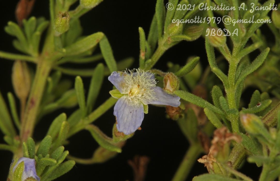 Hierbas perennes o subarbustos, erectos, hasta de 30 cm de alto, muy ramificados, hirsutos. Raíz leñosa, ramificada, gruesa, axonomorfa. Tallos subcuadrangulares, aristados, erectos en la base, rugosos hacia el ápice, ramificados, totalmente pubescentes a glandulosos. Hojas opuestas a 3-verticiladas, sésiles; láminas aciculares a lineares, de 8-15 × 0,5-1 mm, ápice agudo a redondeado, base atenuada, enteras, pubescentes a glanduloso- pubescentes. Flores solitarias o raramente geminadas; pedicelos suberectos, más largos que las hojas, glanduloso-pubescentes. Cáliz 5-partido, segmentos oblongos o lanceolados, de 1,5-2 × 0,5-1 mm, interiormente glanduloso-pubescentes en el ápice. Corola glabra excepto en la base que es vilosa, lóbulos oblongos, azules. Estambres con filamentos delgados ca. 2,5 mm de largo; anteras oblongas, ca. 1 mm de largo, obtusas, tecas separadas en el ápice. Ovario ovoide, de 1-1,3 × 0,8 mm; estilo de 1-2 mm de largo, engrosado hacia el ápice; estigma capitado. Cápsulas elipsoides a oval-elipsoides, de 2-3 × 1,7-2 mm, más largas que el cáliz, glabras. Semillas elipsoides ca. 0,5 × 0,3 mm.