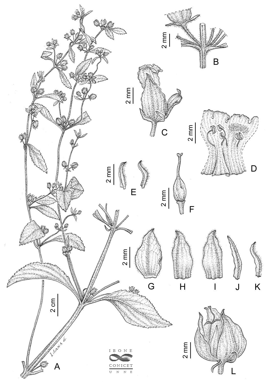 A. Planta. B. Detalle de nudo foliar. C. Flor. D. Corola extendida mostrando estambres. E. Bractéolas. F. Gineceo. G. Lóbulo dorsal del cáliz, vista externa. H-I. Lóbulos laterales del cáliz, vista externa. J-K. Lóbulos internos del cáliz. L. Cáliz fructífero.