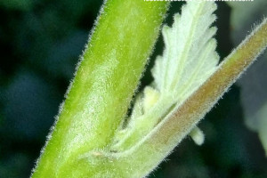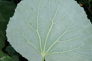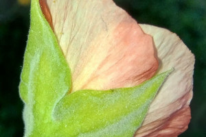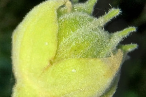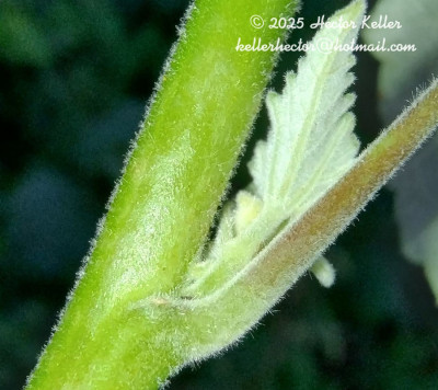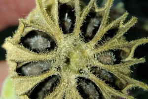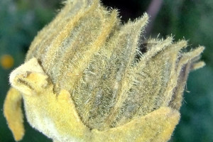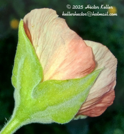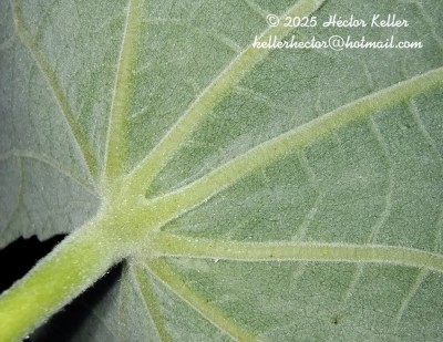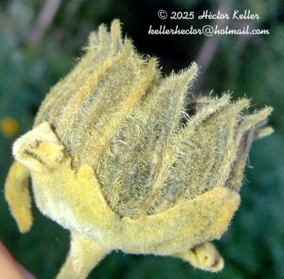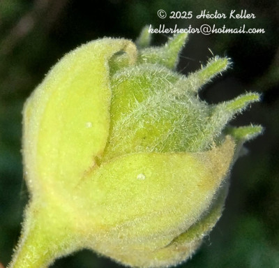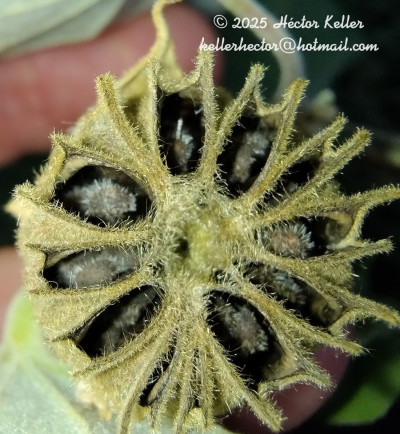Arbusto de ca. 1,5 m de altura, con pubescencia estrellado-afelpado, y con pelos rígidos, de una sola rama sobre tallos y pecíolos. Estípulas 12 × 2 mm, rectas, lanceoladas, caducas. Pecíolo ca. 10 cm de largo. Lámina 14 × 11 cm, acorazonada, 7-palmatinervada, aguda, oscuramente 3-lobada, margen crenado, marcadamente discolor, ambas caras cubiertas completamente de pelos estrellados muy pequeños, más densos y más claros en el envés. Flores axilares, siempre solitarias. Pedúnculos gruesos, hasta de 9 cm de largo, articulados 1 cm por debajo del cáliz. Cáliz de 12-14 mm de largo, con indumento afelpado y con pelos largos esparcidos, lóbulos triangulares, de base ancha. Corola anaranjado-rojiza, 20 mm de largo. Tubo estaminal 2 mm de largo. Fruto con ca. 15 carpelos pluriseminados; mericarpos ca. 13 × 5 mm, agudos en el ápice, afelpado-estrellados en las partes en que no están en contacto entre sí, y con pelos largos, densos, sobre la nervadura media, dehiscentes casi hasta la base. Semillas reniformes, estrellado-pubescentes, péndulas. Cromosomas: 2n = 14.