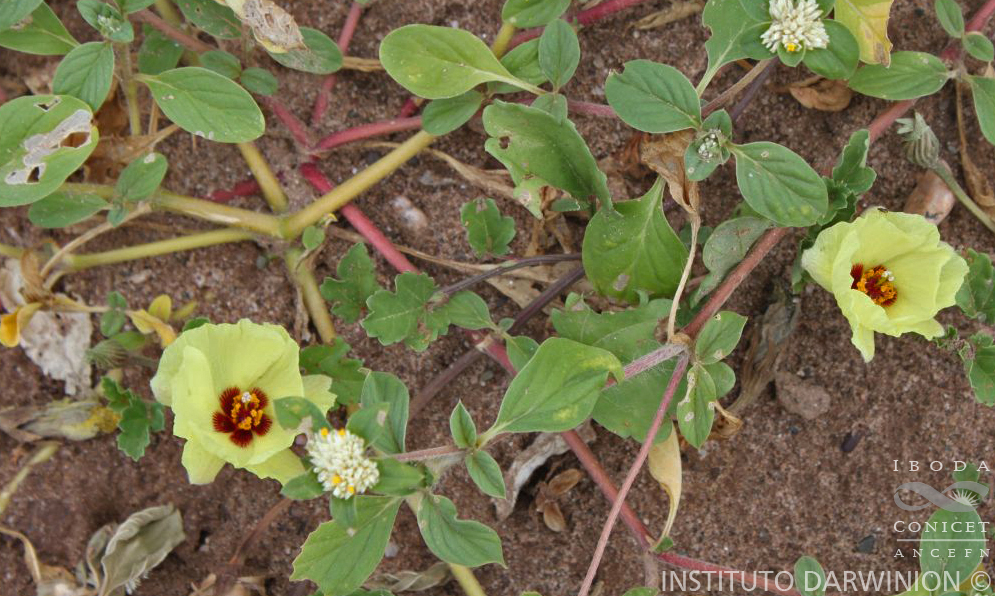 Hierba perenne, sin rizomas, no punteada. Tallos postrados, angulosos, glabros o con algunos pelos simples ca. 1 mm de largo. Estípulas asimétricas, auriculadas, 3-5 × 1-3 mm, margen ciliado. Pecíolo 10-30 mm de largo, canaliculado, hirsuto, principalmente en el canal. Lámina 25-40 × 20-30 mm, ovada, levemente 3-lobada, dentada, truncada, obtusa o aguda, margen ciliado, híspida especialmente en los nervios en el hipofilo, haz subglabro. Flores solitarias, axilares. Pedúnculo 20-70 mm de largo, anguloso, ensanchado arriba, con pelos simples esparcidos. Calículo ausente. Cáliz 12-20 mm de largo, híspido, especialmente en los nervios y márgenes; lóbulos lanceolados. Pétalos 30-40 mm de largo, amarillos con mancha rojo-oscura basal. Androceo 15 mm de largo. Gineceo 25 mm de largo, estigmas no divididos. Fruto 3-carpelar, 10 mm de largo, globoso, apiculado, rugoso, glabro. Semillas 4 por carpelo, 4 mm de largo, completamente cubiertas de pelos sedosos, ensortijados, ca. 5 mm de largo.