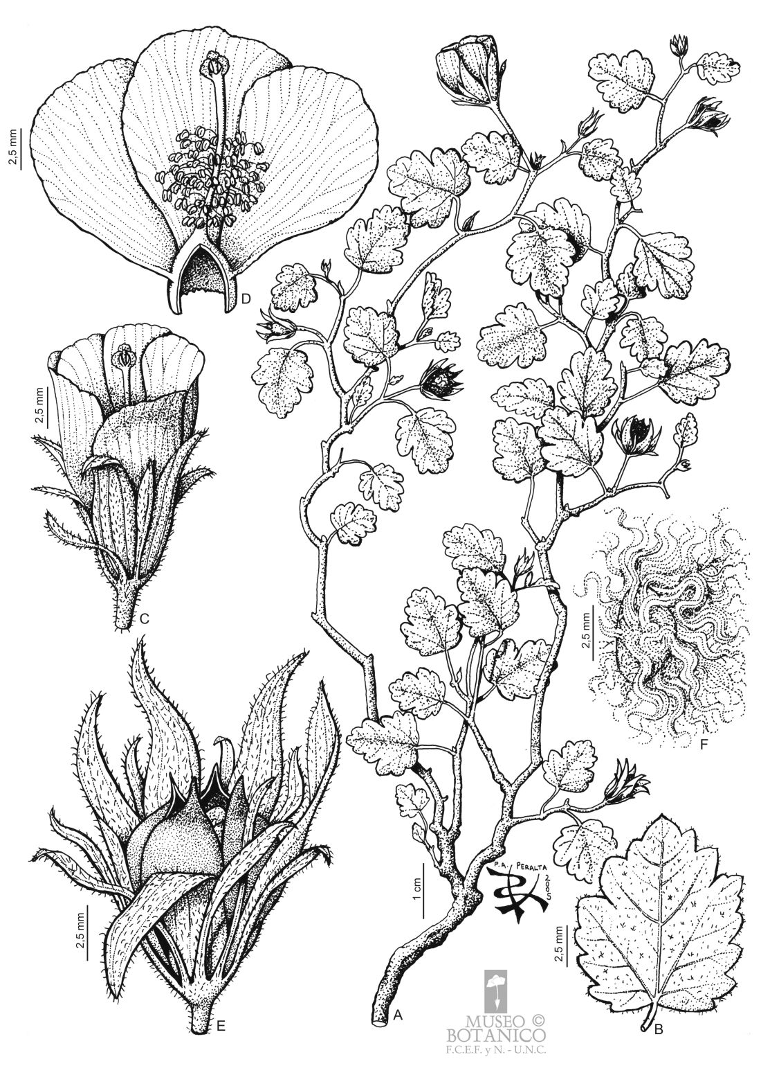 A. Rama con flor y frutos. B. Hoja. C. Flor, vista lateral. D. Sector de flor con tubo estaminal soldado a la corola y ramas estigmáticas sobresaliendo del tubo. E. Fruto con cáliz y calículo. F. Semilla comosa.