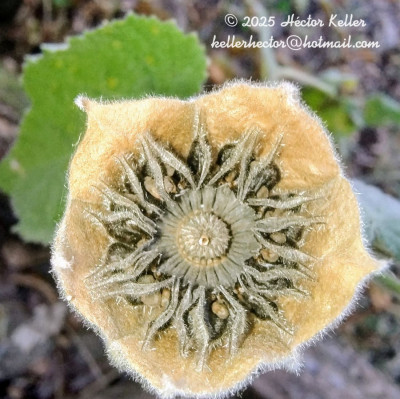 Subarbusto de 1 a 1,70 m de altura, erecto. Tallos velutinos, los pelos estrellados dejan ver algo la epidermis. Estípulas persistentes, filiformes, de 9 mm de largo. Pecíolos más breves que la lámina, de 2-5 cm de largo, aterciopelados. Lámina discolor, hasta de 9,5 × 5 cm, subtriangular, aovado alargada, de base cordada, seno cerrado, ápice agudo, margen crenado, 5-7-palmatinervada ; haz aterciopelado, con pelos estrellados algo esparcidos y con algunos pelos simples glandulosos; envés ceniciento, aterciopelado, densamente cubierto de pelos estrellados. Flores solitarias, axilares, distribuidas a lo largo de las ramas. Pedúnculos de 6-8 cm de largo, gruesos, velutinos, articulados 1 a 2 cm por debajo de la flor. Cáliz velutino, densamente cubierto de pelos estrellados, pentágono-alado, dividido casi hasta la base en 5 lóbulos, acrescente; lóbulos acorazonados, 15 × 15 mm, en la antesis, seno basal de 3 mm de largo, cerrado, soldados entre sí ca. 3 mm basales, cara externa velutina, cara interna también, pero glabra hacia la base. Corola amarilla, del mismo largo o un poco más que el cáliz; tubo de la corola de 1 mm de largo, glabro; pétalos 10 × 9 mm, uña con pocos pelos. Tubo estaminal de 2 mm de largo, glabro, estambres numerosos, agrupados en el ápice del tubo. Ovario con 25 a 28 carpelos; óvulos 5, superpuestos, 1-seriados; estilos tantos como carpelos, de 4 mm de largo, porción soldada 1 mm, cubierta por el ápice del ovario; estigmas capitados, con algunos pelos en el ápice. Fruto envuelto por el cáliz acrescente, lóbulos del cáliz hasta de 30 × 27 mm. Carpidios negros a la madurez, de 12 mm de largo, (incluidas las aristas apicales) × 6 mm de ancho, aristas de 2 mm de largo, hacia la base, en el dorso, puede haber o no dos espinas incipientes. Cara externa cubierta de pelos estrellados, excepto la parte de las caras laterales donde se adosa con los carpidios contiguos, dehiscentes desde el ápice hasta el nacimiento de la lengüeta interna, a partir de allí indehiscente y en esta última porción las paredes laterales presentan un reticulado muy tenue, cara interna con cortos pelos estrellados sobre el nervio medio y en el margen de las paredes, que no está en contacto con las semillas; a la madurez el nervio medio se separa en la base de los carpidios, manteniendo a éstos unidos al eje del fruto. Semillas 5, uniseriadas, superpuestas, piriformes, con cortos pelos esparcidos.