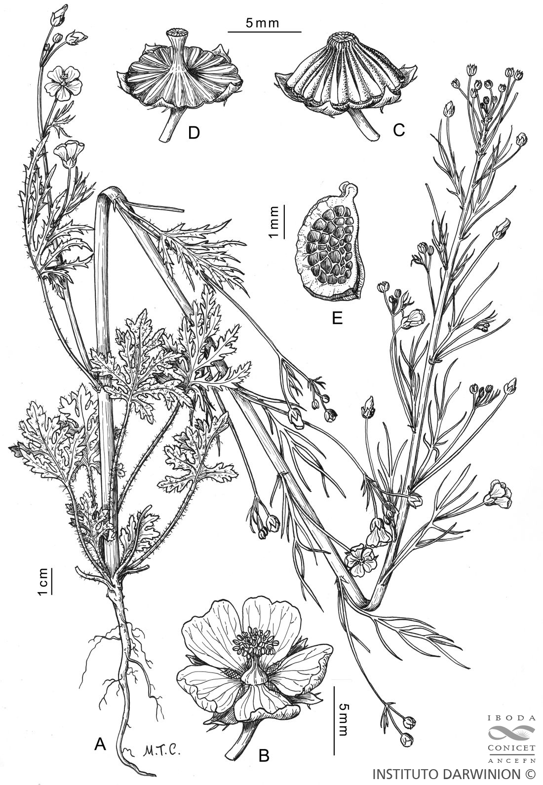 Hierba anual de raiz axonomorfa. Tallos hasta de 1 m de altura, erectos, huecos en ejemplares de herbario, generalmente glabros. Estípulas lanceoladas. Lámina foliar hasta de 12 cm de diámetro, las inferiores arrosetadas, enteras, lobuladas, las superiores palmatipartidas, con lacinias a su vez divididas; hojas de la base de las inflorescencias a veces 3-partidas o filiformes. Racimos terminales compuestos; las primeras flores del eje principal de la inflorescencia naciendo en la axila de hojas completas, pequeñas, las demás flores en la axila de brácteas pequeñas, 2-fidas. Pedúnculos hasta de 5,5 cm, con una articulación hacia el ápice a partir de la cual el pedúnculo se dobla hacia abajo a la madurez del fruto y se quiebra. Cáliz de 3-4 mm, glabro. Pétalos hasta de 7 mm. Estigmas capitados. Mericarpos provistos en el ápice de un par de alas de ca. 1 mm y con las paredes laterales reticuladas. Semilla piriforme, parda.