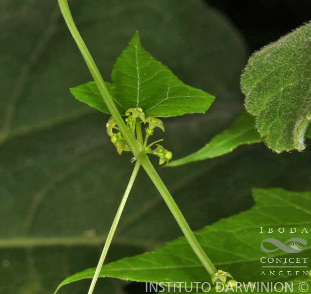 Tallos estriados, glabros o pubérulos en los nudos. Hojas enteras, con pecíolos de 6-10 mm de largo; láminas 5-anguladas, de 70-90 × 60-80 mm, con 2-6 dientes glandulares en la base, hojas de los nudos floríferos usualmente ovado-subuladas (a veces 3-5- lobadas con lobo central subulado muy desarrollado y lobos laterales reducidos o apenas insinuados) base redondeada. Zarcillos 3-fidos (en nudos inferiores), 2-fidos (en nudos superiores). Tirsos estaminados de 8-10 mm de largo, sin un eje principal definido (excepcionalmente sí, y en ese caso son más largos), cimas laterales siempre laxas, con eje secundario y pedicelos florales bien desarrollados.. Flores estaminadas con hipanto de 2-2,5 mm de diámetro; sépalos de 0,75 mm de largo; pétalos de 2- 2,5 × 1-1,5 mm, blanquecinos; sinantéreo de 0,25 mm de largo. Flores carpeladas con pedicelos de 2-40mm, ovario ca. 1 × 0,5 mm; estigma de 0,5 mm de diámetro. Elaterios de 7-12 mm de largo, con pedicelo de 2-50 mm, cara convexa más oscura y equinada que los flancos. Semillas 2-3, cuadrangulares, más o menos comprimidas, de (2,5-)4-6 mm de largo, con 4 pliegues cruciformes en una de sus caras y borde rala e irregularmente equinado.