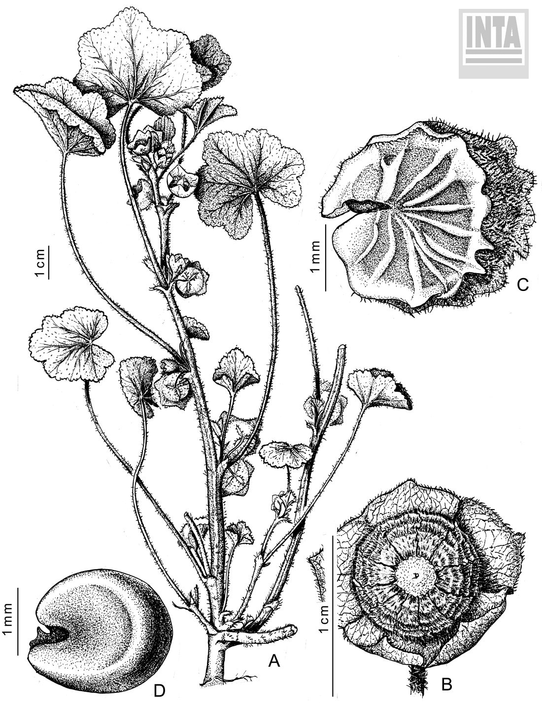 Hierba anual, con el eje central erecto, de 50 cm de altura y ramas laterales postradas. Tallos subglabros. Estípulas de 5 × 2,5 mm, triangulares, con pelos solo en el margen y en la base. Hojas largamente pecioladas; pecíolos hasta de 15 cm, pubescentes. Hojas desde muy pequeñas hasta de 8,5 × 9,5 cm, arriñonadas, 5-7-lobadas, crenadas, cara adaxial subglabra y la abaxial levemente pubescente. Glomérulos axilares de 3-6 flores, por lo común brevemente pedunculadas. Cáliz de 3 mm, muy acrescente a la madurez, con pelos cortos sobre el margen de los lóbulos. Corola de igual largo que el cáliz, blanca. Fruto de ca. 10 mericarpos, incluido en el cáliz acrescente y rodeado por los lóbulos del cáliz, muy anchos y revolutos. Mericarpos de 3 × 3 mm, pubescentes y con retículo muy profundo. [Planta perenne, con tallos de 30-80 cm, rastreros o erectos, glabros o con pelos estrellados y simples. Hojas con láminas de 1,5-5 × 1,8-5,5 cm, suborbiculares, 5-7 lobuladas, margen crenado, base acorazonada; pecíolos largos. Flores dispuestas en grupos de 2-4, axilares. Calículo con 3 brácteas, de 1-2 mm, lineares, pestañosas. Cáliz de 3 mm, acrescente, orbicular-lobulado. Pétalos espatulados, de 4-5 mm, azul-liláceos. Mericarpos con ángulos ligeramente alados, cara dorsal rugosa, reticulada.] [Hierba anual, eje central hasta de 50 cm de altura, ramas laterales horizontales, tendidas. Estípulas triangulares, 5 × 2,5 mm. Pecíolos hasta de 15 cm de largo. Lámina foliar desde muy pequeñas hasta 8,5 × 9,5 vm, arriñonada, 5-7-lobada,margen crenado, haz subglabro, envés levemente pubescente. Glomérulos axilares 3-6-floros, flores por lo común cortamente pediceladas. Calículo de 3 bractéolas subuladas, de 2 mm de largo, levemente pubescentes. Cáliz de 3 mm de largo, muy acrescente a la madurez, con pelos cortos sobre el margen de los lóbulos. Corola de igual largo que el cáliz, blanca. Fruto de 10 mericarpos cubiertos por el cáliz acrescente con lóbulos muy anchos y revolutos; mericarpos 3 × 3 mm, pubescentes y con retículo muy marcado. Cromosomas: 2n = 42.]
