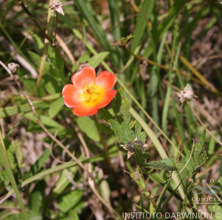Hierba perenne, con raíces engrosadas; ramas rastreras, radicantes en los nudos y con ramas floríferas erguidas o apoyantes. Pecíolos hasta de 9 cm de largo, con pelos estrellados, gruesos y ralos. Lámina foliar palmatinervada, suborbicular, de 10 × 10 cm, 3-5-partida; lóbulos profundamente crenados; ambas caras con pelos estrellados de pocas ramas, aplastados, esparcidos. Estípulas asimétricas, subfalcadas, anchas, de 10 × 4 mm de ancho, persistentes. Flores solitarias. Pedúnculos unifloros, hasta de 15 cm de largo, más largos que las hojas correspondientes, articulados cerca del ápice. Calículo formado por 3 bractéolas anchas, de 10 × 5 mm, trasovadas, algo soldadas a la base del cáliz; cara externa con pelos estrellados esparcidos o glabra, y margen ciliado. Cáliz campanulado, de 12 mm de largo, lóbulos lanceolados. Pétalos anaranjados o rosados, asimétricos, de 20 mm de largo y con el margen basal piloso. Tubo estaminal de 3 mm de largo, piloso; estambres numerosos. Fruto con ca. 12 carpelos. Mericarpos de 4 × 3,5 mm, hirsutos, con dos pequeños muriformes o aristas breves en la parte superior; divididos en dos porciones, limitadas por la endoglosa, lisa y dehiscente la superior, y estriada, con el dorso rugoso la inferior. Semilla arriñonada, parda. Cromosomas: 2n = 100.
