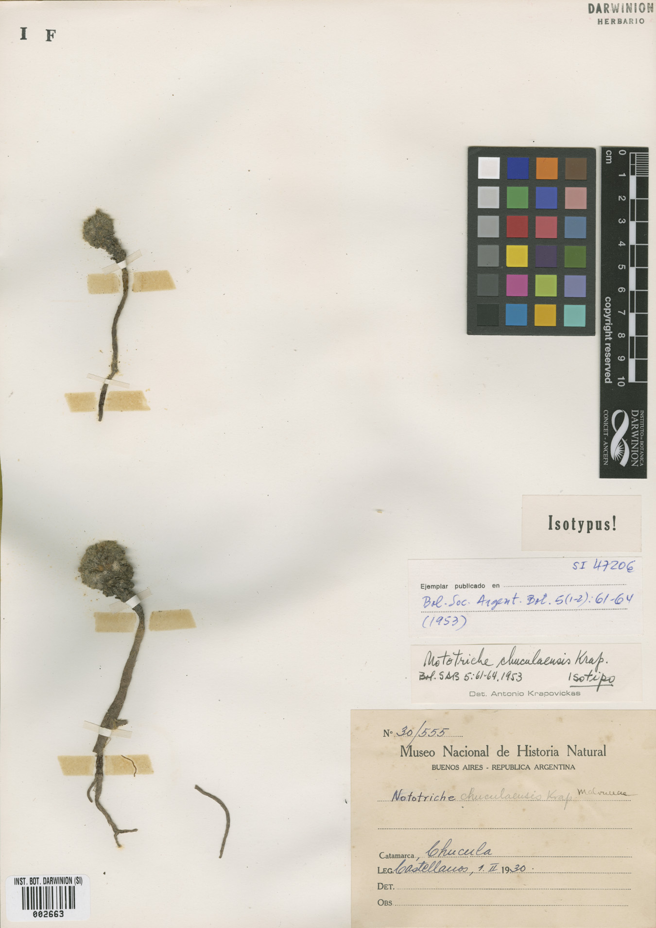 Material Tipo: Argentina. Catamarca. Dpto. Tinogasta. Chucula, 1 Feb 1930, A. Castellanos s.n. [lectotipo, BA-30/555a, designado por A. M. Cialdella & N. O'Leary, Phytotaxa 411(3): 207. 2019; isolectotipos, BA-30/555b, SI 002663).