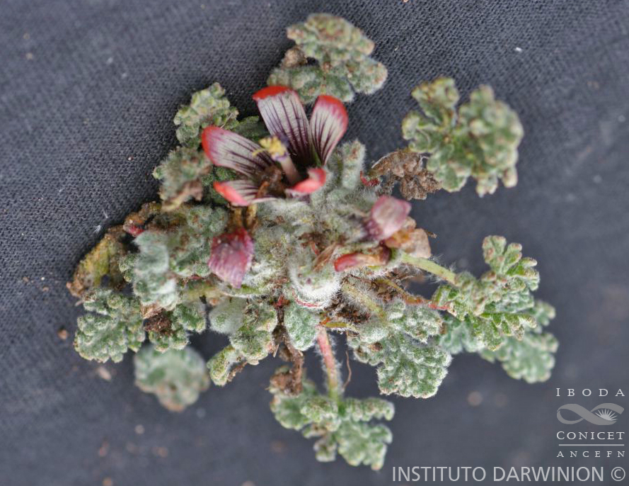 Planta perenne. Hojas en roseta, apretadas. Peciolo de 8-10 mm, vaina de 3 mm de ancho. Estípulas adnatas al pecíolo hasta el tercio superior, parte libre de 3-5 mm, aguda, ápice con pocos pelos estrellados. Lámina redondeada a reniforme, 5 lobulada, de 6 × 8 mm, ambas caras tomentosas, con pelos estrellados, lóbulos palmados, obovados, obtusos, enteros, apretados. Flores ubicadas en la mitad del peciolo. Cáliz de 9 mm, lóbulos triangular-ovados, subagudos, cara externa con pelos estrellados cortos, tomentosa. Corola de color azul, de 1-1,2 cm; pétalos obovados, obtusos, base del tubo de 2 mm. Fruto formado por alrededor de 14 mericarpos.