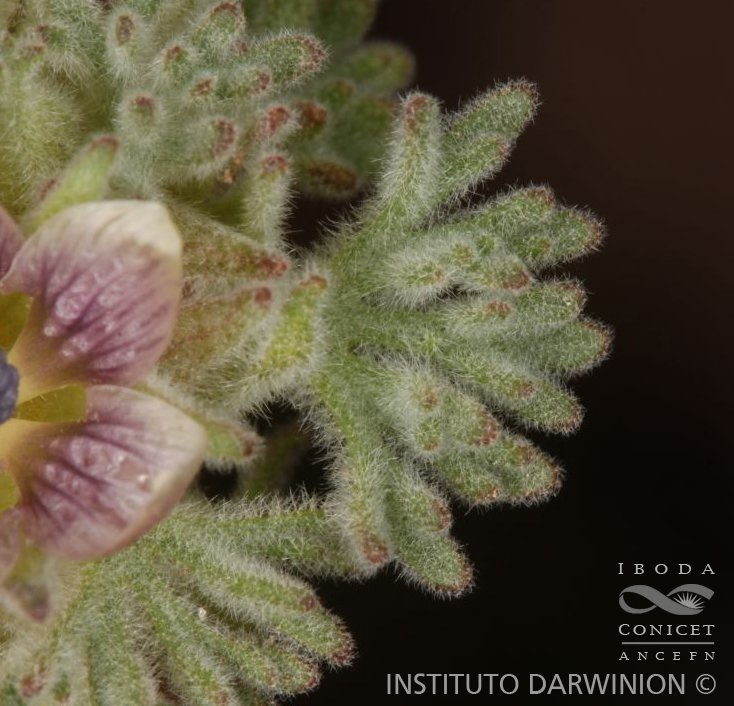Hierba perenne, arrosetada, de ca. 3 cm de diámetro, con las hojas a nivel del suelo. Tallo subterráneo ca. 1 cm de diámetro. Estípulas y pecíolo soldados formando una vagina de 7-10 × 2-3 mm de ancho en la base, con los bordes laxamente ciliado-estrellados. Parte libre de las estípulas triangular-lanceolada, de 6-8 × 1 mm de ancho en la base, de borde ciliado-estrellado. Estípulas y vagina con el epifilo con pelos estrellados ralos y con el hipofilo subglabro. Porción libre del pecíolo de 3-5 × 1 mm de ancho en la base, de borde ciliado-estrellado, epifilo con pelos estrellados más o menos ralos, pero mas densos que en la vagina y estípulas, hipofilo subglabro; el pecíolo se ensancha hacia el ápice, de modo que no hay límite definido entre pecíolo y lámina. Lámina flabeliforme, de 5-6 mm de largo, por más o menos 8 mm de ancho, 7-lobada, lóbulos a su vez lobados; epifilo densamente piloso, hipofilo subglabro, con pelos estrellados muy ralos que dejan ver casi toda la epidermis; borde con pelos estrellados más o menos aplastados, no ciliados como en las estípulas, pecíolo y vagina. Flor solitaria, sentada en el punto en que se separan los ápices libres de las estípulas. Calículo 0. Cáliz de ca. 7 mm de largo, exterior con pelos estrellados blancos ralos sobre el tubo, más tupidos hacia la punta de los dientes; dientes triangulares, de 3 × 1,5-2,5 mm, bordes ciliado-estrellados; nectarios triangulares, de ca. 4 × 1 mm de base, más largos que el tubo del cáliz. Corola lilácea en seco, glabra; tubo de la corola de 2-3 mm de largo, pétalos da ca. 7 × 3 mm, asimétricos, con escotadura apical. Tubo estaminal glabro, estrecho, de ca. 2 mm de largo; estambres en cabezuela globosa. Estigmas ca. 10, capitados. Carpelos ca. 10; 1-ovulados, ovarios erectos. Fruto maduro no visto, mericarpios inmaturos aristados, con al dorso y base con pelos estrellados aplastados, ápice y aristas largamente y densamente ciliados.