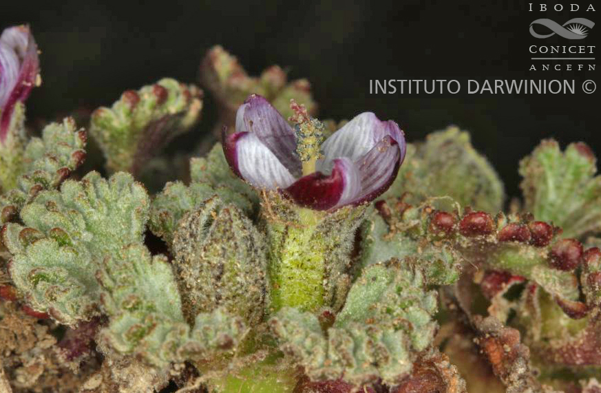 Hierba perenne, arrosetada, de ca. 5 cm de diámetro, con las hojas a nivel del suelo. Tallo subterráneo de ca. 1 cm de diámetro. Estípulas y pecíolo soldados, formando una vagina de 6-7 × 4 mm. Parte libre de las estipulas triangulares, de ca. 6 × 2 mm de ancho en la base. Estípulas y vagina glabras, con pelos estrellados ralos sobre los bordes. Porción libre del pecíolo de ca. 4 × 1 mm, completamente glabra. Lámina flabeliforme, hasta de 7 × 12 mm, 11-13-lobada, lóbulos obtusos, cortos, los inferiores enteros, los siguientes 1-6-lobados; epifilo densarnente cubierto por pelos estrellados lanosos, blancos, hipofilo glabro. Flor solitaria, sentada en el punto en que se separan los ápices libres de las estípulas. Calículo 0. Cáliz con el tubo subglabro, dientes triangulares, de 2 × 1,5 mm, exteriormente pilosos; nectarios aislados, de 0,5 × 0,8 mm. Corola azul claro, glabra; tubo de la corola de 2-3 mm de largo; pétalos de 6-7 × 3-4 mm, levemente asimétricos, con una escotadura apical; cada pétalo se continua sobre el tubo de la corola formando dos alas de ca. 1 mm de largo. Tubo estaminal glabro, de 2-3 mm de largo; anteras en masa globosa. Estigmas 10-13, capitados. Carpelos 1-ovulados. Fruto esquizocárpico, mericarpios 10-13, dehiscentes, de 4,5 mm de largo (incluida la arista de ca. 1,7 mm) por 2,5 mm de ancho; dorso con pelos estrellados aplastados, aristas estrellado-ciliadas; semilla arrinonada, parda.