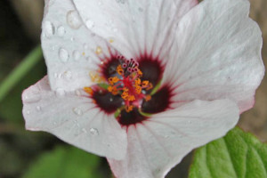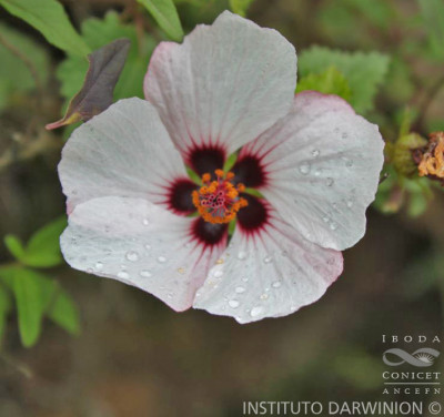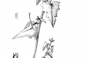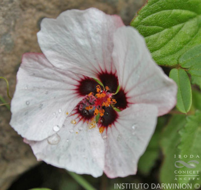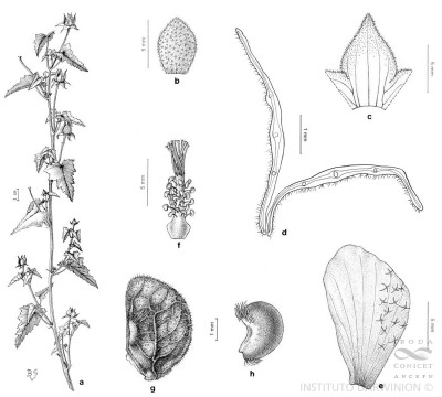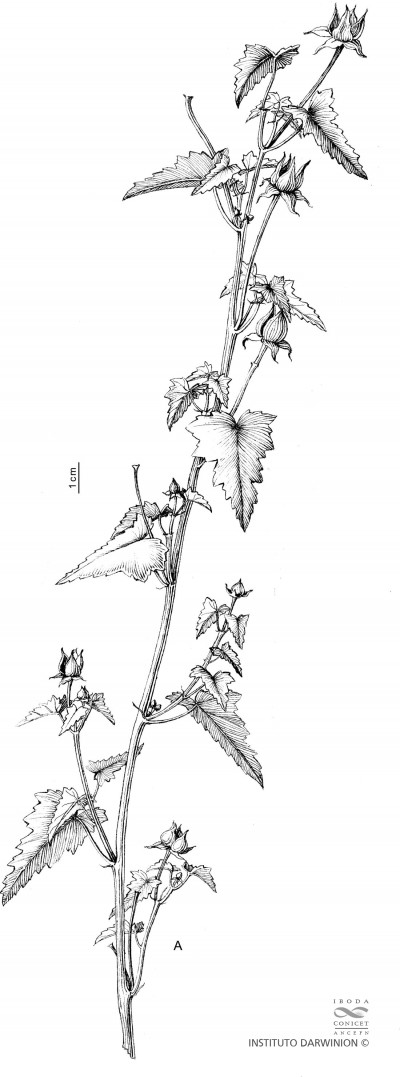 Subarbusto hasta de 60 cm de altura, tallos cubiertos de pelos estrellados muy cortos, adpresos. Estipulas subuladas, 2 a 4,5 mm de largo. Peciolo de 1-2 cm de largo. Lámina foliar hasta de 4 × 2,5 cm, subtriangular, a veces con 3 a 5 lóbulos irregulares, base redondeada, margen con dientes profundos e irregulares, ambas caras cubiertas de pelos estrellados, cortos, adpresos, algo mas abundantes en el envés, sin pelos glandulosos. Flores solitarias a lo largo de las ramas. Pedúnculos de 1-4,5 cm de largo. Bracteolas 5, ovales, retroflexas, 6-7 × 3-4 mm, cubiertas de pelos estrellados, cortos, adpresos. Cáliz de 10 mm de largo, pubescente, cubierto de pelos estrellados muy cortos, lóbulos 5-nervados, 8 × 5-6 mm, agudos, base ancha y márgenes de dos lóbulos contiguos replegados. Pétalos liliáceos, con mancha basal y nervaduras mas oscuras, 17 × 8-10 mm, una pilosa y con escasos pelos estrellados hacia el ápice del pétalo. Tubo estaminal de 6 mm de largo, con el borde superior dentado, estambres libres desde la base hasta el ápice del tubo estaminal. Pistilos sobrepasando 3 mm al tubo estaminal. Carpelos 4 × 3 mm, pubescentes, no aristados, nervio medio no prominente, reticulado suave. Semilla lisa, con dos mechones de pelos, uno encima y el otro debajo del hilo. Cromosomas: 2n = 56.