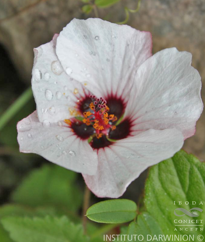 Subarbusto hasta de 60 cm de altura, tallos cubiertos de pelos estrellados muy cortos, adpresos. Estipulas subuladas, 2 a 4,5 mm de largo. Peciolo de 1-2 cm de largo. Lámina foliar hasta de 4 × 2,5 cm, subtriangular, a veces con 3 a 5 lóbulos irregulares, base redondeada, margen con dientes profundos e irregulares, ambas caras cubiertas de pelos estrellados, cortos, adpresos, algo mas abundantes en el envés, sin pelos glandulosos. Flores solitarias a lo largo de las ramas. Pedúnculos de 1-4,5 cm de largo. Bracteolas 5, ovales, retroflexas, 6-7 × 3-4 mm, cubiertas de pelos estrellados, cortos, adpresos. Cáliz de 10 mm de largo, pubescente, cubierto de pelos estrellados muy cortos, lóbulos 5-nervados, 8 × 5-6 mm, agudos, base ancha y márgenes de dos lóbulos contiguos replegados. Pétalos liliáceos, con mancha basal y nervaduras mas oscuras, 17 × 8-10 mm, una pilosa y con escasos pelos estrellados hacia el ápice del pétalo. Tubo estaminal de 6 mm de largo, con el borde superior dentado, estambres libres desde la base hasta el ápice del tubo estaminal. Pistilos sobrepasando 3 mm al tubo estaminal. Carpelos 4 × 3 mm, pubescentes, no aristados, nervio medio no prominente, reticulado suave. Semilla lisa, con dos mechones de pelos, uno encima y el otro debajo del hilo. Cromosomas: 2n = 56.