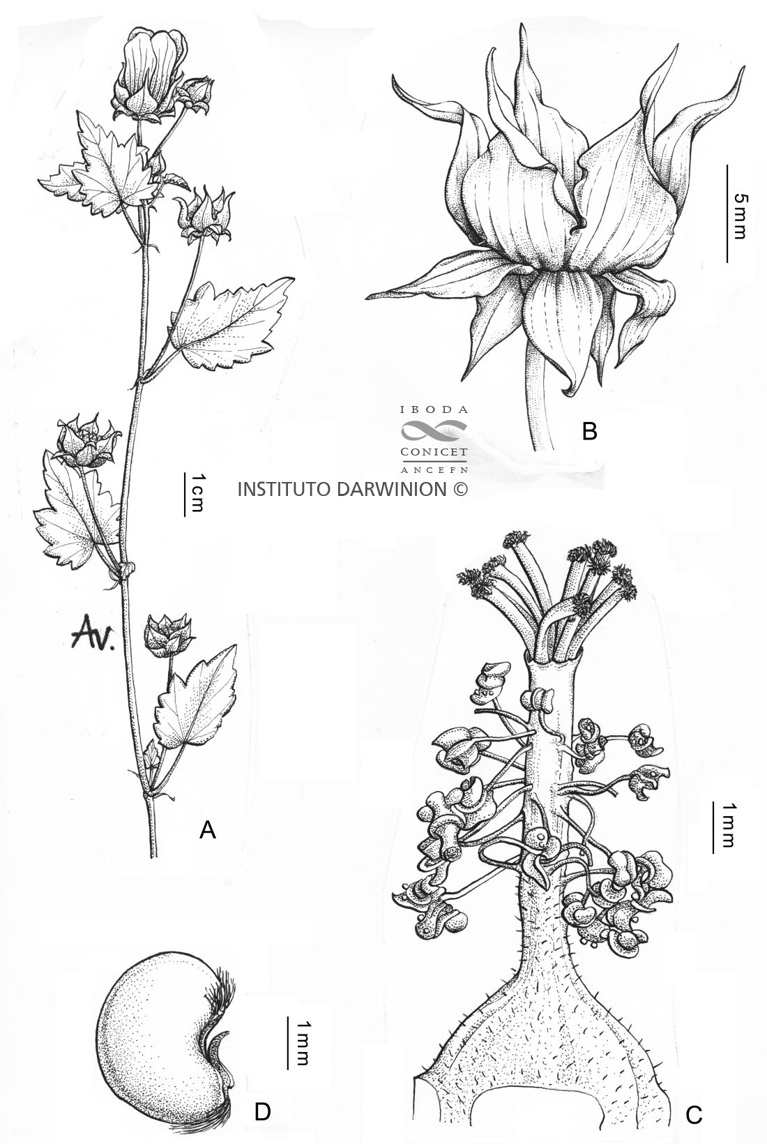 Subarbusto hasta de 60 cm de altura, tallos cubiertos de pelos estrellados muy cortos, adpresos. Estipulas subuladas, 2 a 4,5 mm de largo. Peciolo de 1-2 cm de largo. Lámina foliar hasta de 4 × 2,5 cm, subtriangular, a veces con 3 a 5 lóbulos irregulares, base redondeada, margen con dientes profundos e irregulares, ambas caras cubiertas de pelos estrellados, cortos, adpresos, algo mas abundantes en el envés, sin pelos glandulosos. Flores solitarias a lo largo de las ramas. Pedúnculos de 1-4,5 cm de largo. Bracteolas 5, ovales, retroflexas, 6-7 × 3-4 mm, cubiertas de pelos estrellados, cortos, adpresos. Cáliz de 10 mm de largo, pubescente, cubierto de pelos estrellados muy cortos, lóbulos 5-nervados, 8 × 5-6 mm, agudos, base ancha y márgenes de dos lóbulos contiguos replegados. Pétalos liliáceos, con mancha basal y nervaduras mas oscuras, 17 × 8-10 mm, una pilosa y con escasos pelos estrellados hacia el ápice del pétalo. Tubo estaminal de 6 mm de largo, con el borde superior dentado, estambres libres desde la base hasta el ápice del tubo estaminal. Pistilos sobrepasando 3 mm al tubo estaminal. Carpelos 4 × 3 mm, pubescentes, no aristados, nervio medio no prominente, reticulado suave. Semilla lisa, con dos mechones de pelos, uno encima y el otro debajo del hilo. Cromosomas: 2n = 56.