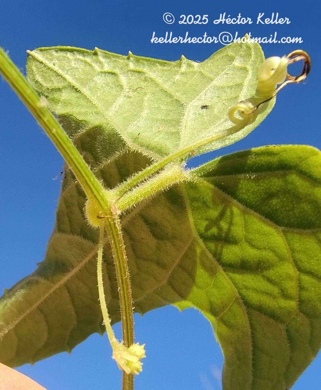 Terófitos diclinomonoicos. Pecíolos de 3-20 mm de largo; láminas ovado-triangulares a suborbiculares, 3-5-lobadas a pedatipartidas, de 7-8 × 6-7 cm, margen remotamente dentado, haz generalmente verde rojizo. Zarcillos simples. Monocasios estaminados racemiformes; pedúnculos de 15-45 mm de largo. Flores estaminadas con hipanto campanulado, de 2-3 × 1,5-2 mm; sépalos de 1,5-2 mm; pétalos de 2,5 mm, blancos o amarillos; anteras de 1 mm de largo, conectivo hirsuto, no ciliado. Flores carpeladas con pedicelos de 30-50 mm de largo; ovario oblongofusiforme, de 10 × 3 mm; nectario peristilar subtrilobado. Bayas oblongo-fusiformes, de 25-35 × 9-12 mm. Semillas ovoides, de 4- 5 × 2-3 × 1 mm, cenicientas, tegumento levemente escrobiculado.