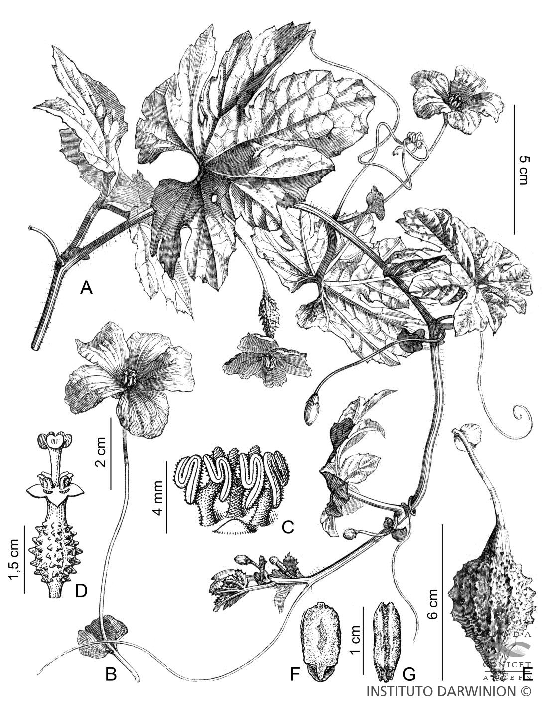 Terófitos diclinomonoicos zarcillosos. Pecíolos de 2-4 cm de largo; láminas suborbiculares, de 5-10 cm de largo, 5-7- pedatipartidas, casi pedatisectas, margen dentado. Zarcillos simples. Flores estaminadas solitarias; pedúnculos de 5-30 mm de largo; pedicelos de 20-55 mm de largo, el límite entre ambos lo establece una bráctea reniforme, sésil, de 3-15 × 4-22 mm; hipanto cupuliforme; sépalos ovado-lanceolados, de 3-6,5 × 2-3 mm; pétalos de 11-22 × 7-15 mm, amarillos. Flores carpeladas solitarias; pedúculos de 10-50 mm de largo, con bráctea reniforme, sésil; pedicelos de 10-100 mm de largo; ovario fusiforme, 10-30 × 2-4 mm, muricado. Cápsulas ovoideo-acuminadas, de 6-10 × 2-4 cm, 3- valvadas, dehiscencia longitudinal descendente, anaranjadas o rojizas, con tubéculos cónicos. Semillas comprimidas, de 8-11 × 4- 6 × 2,5-3 mm, envueltas en un saco ariloideo rojo, adhesivo.