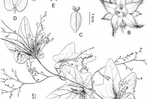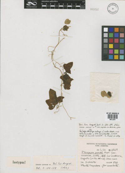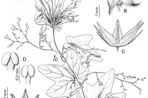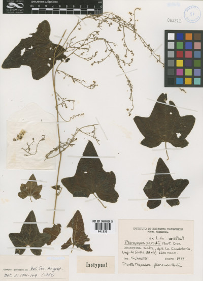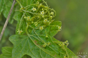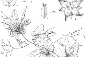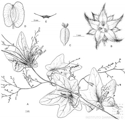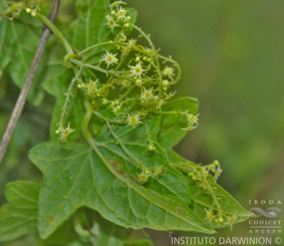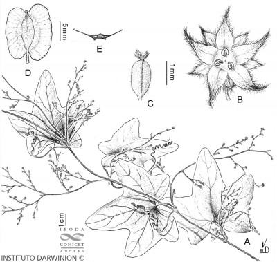 Hemicriptófitos dioicos; raíz subesférica, de 7-8 cm de diámetro. Pecíolos de 1-3 cm de largo; láminas suborbiculares a deltoideas, de 3-10 × 3-10 cm, enteras o 3-5-lobadas, membranáceas a más o menos rígidas. Zarcillos sensibles por encima y por debajo del punto de bifurcación. Flores estaminadas de 2-2,5 mm de diámetro, dispuestos en tirsos bracteados de 2-12 cm de largo; brácteas más o menos foliosas, hasta reducidas y escuamiformes en los grupos cimosos de mayor grado de ramificación; hipanto rotáceo, piloso; sépalos de 0,6-0,8 mm de largo; pétalos de 1-1,2 mm de largo; filamentos y anteras de 0,2-0,3 mm de largo, tecas de los estambres dobles verticales, teca del estambre simple de posición horizontal, frecuentemente se observa un estambre doble reducido o abortado. Flores carpeladas en monocasios racemiformes, paucifloros; ovario de 1,5 × 0,8-1 mm. Sámaras suborbiculares, de 13-17 × 13-17 × 2 mm, de base y ápice emarginados, membranáceas, reticuladas, pasible de ser separadas en dos mitades longitudinales por tracción (como una cápsula 2-valvada, alada). Semillas ovoideocomprimidas, de 7 × 5-6 × 1,5 mm, ligeramente marginadas.
