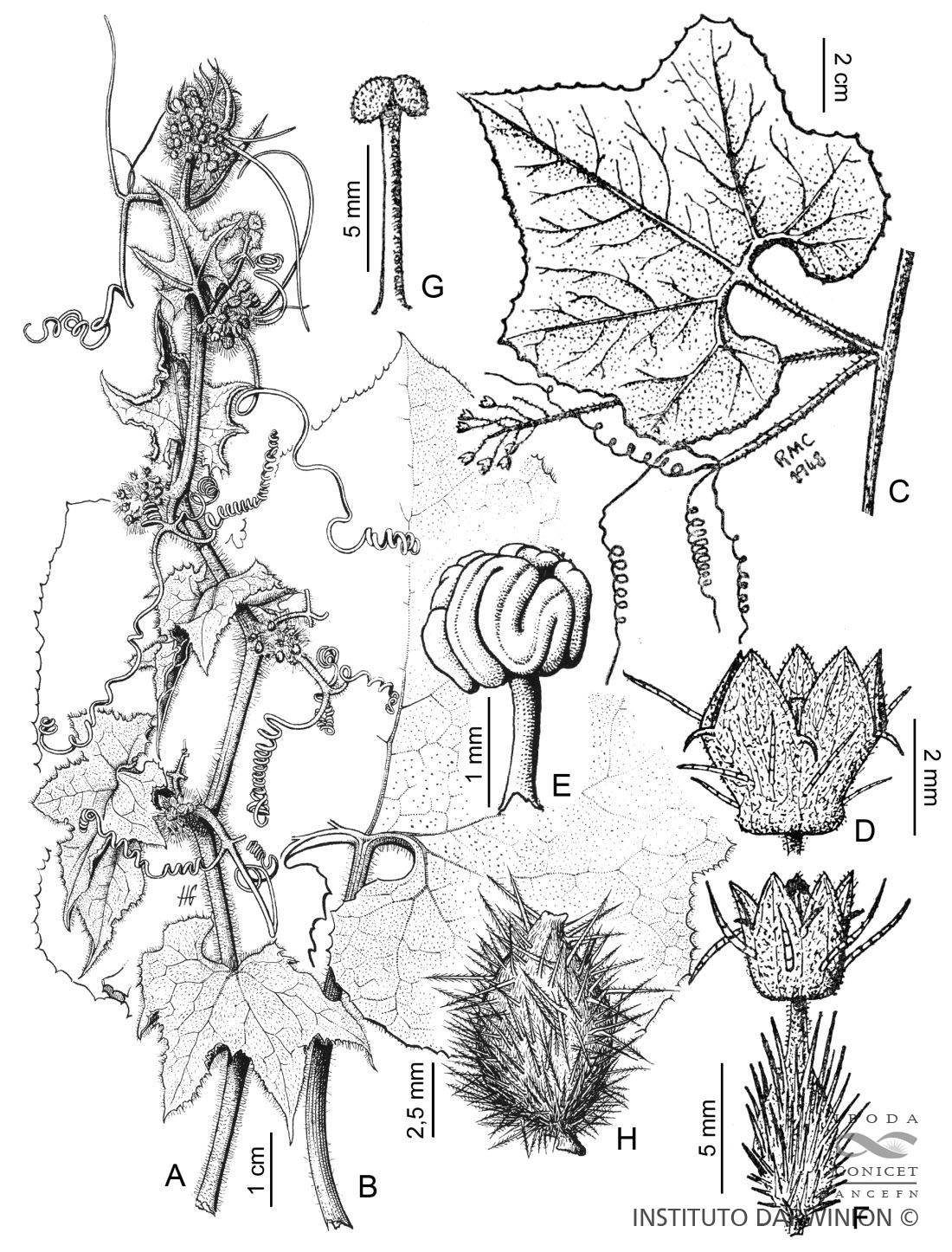 Terófitos zarcillosos con tallos plurimetrales. Hojas con pecíolos de 2-10 cm de largo; láminas suborbiculares o cordadas, de 3-7 × 6-12 cm, levemente 5-7-lobadas, margen con dientes remotos. Zarcillos 2-4-fidos. Monocasios racemiformes simples, 10-15-floros, de 2-15 cm de largo. Flores estaminadas con hipanto obcónico; sépalos lineares; pétalos de 2-3 mm de largo, blancoverdosos; columna filamentaria de 0,7-1,5 mm de largo; sinantéreo de 1 mm de largo. Flores carpeladas subsésiles, en glomérulos 4-20-floros; pedúnculos de 1,5-3 cm de largo. Aquenios ovoideos u obovados, de 6-7 × 4-5 × 3,5-4,5 mm, algo comprimidos, densamente equinados, espinas retrorso- pubescentes. Semillas elipsoides, de 6 × 4 × 3,5 mm, pardo-amarillentas.