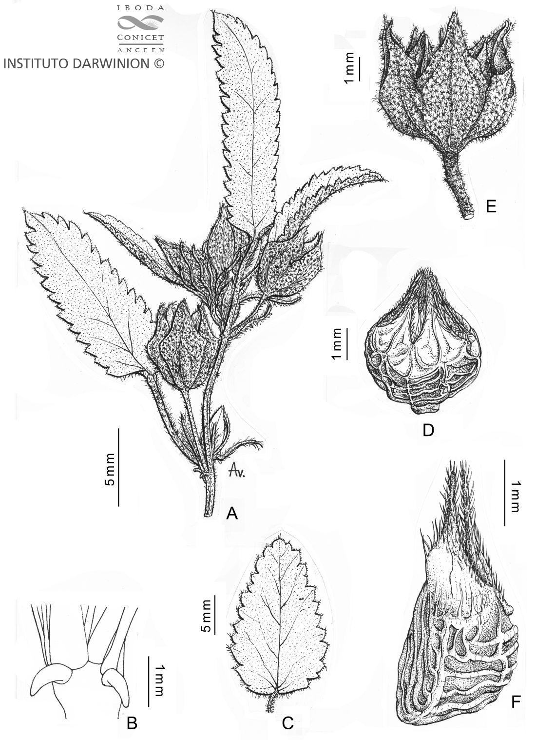 Hierba subleñosa, erguida, hasta de 70 cm de altura. En la base de los pecíolos hay una a tres espinas en forma de gancho. Estípulas filiformes, subuladas, de 4-5 mm de largo, caducas. Pecíolos hasta de 2 cm de largo. Lámina oval-lanceolada hasta lineal, aguda, 1-4 × 0,5-2 cm, margen dentado desde la base, algo discolor, haz con pelos cortos, que dejan ver la epidermis y envés incano-tomentoso. Flores axilares, solitarias, cortamente pedunculadas. Pedúnculos de 5-10 mm de largo. Cáliz campanulado, piloso, anguloso en la base. Pétalos amarillos o crema, 5 × 4 mm. Fruto 5-carpelar, cónico, piloso en el ápice. Mericarpos 4-5 × 2 mm, reticulados en la mitad inferior, 2-aristados, dehiscentes desde el ápice hasta la porción reticulada, que es indehiscente. 2n = 14. [Hierba anual o perenne, raro subarbusto. Tallos de 50-100 cm de alto, erectos, pubescentes. Lámina de 4-6 × 2,5-3 cm, densamente cubierta de pelos estrellados, ovada a ovado-lanceolada o angostamente lanceolada, margen crenado-dentado, ápice obtuso a subagudo, base redondeada a truncada o subcordada. Pecíolo hasta de 3 cm, en las hojas mayores presenta protuberancias espiniformes. Estípulas hasta de 7 mm, lineares, subuladas. Flores fasciculadas, axilares, raro solitarias; pedicelos de 4-5 mm. Cáliz de 5-7 mm, lóbulos triangulares a agudos, apiculados. Pétalos de 4-6 mm, obovados, asimétricos, amarillos, ápice escotado. Fruto formado por 5 mericarpos, verrucosos, dehiscentes apicalmente, 2-rostrados, con las espinas prominentes, erectas y divergentes.] [Planta perenne, erguida, hasta de 70 cm de altura. En la base de los pecíolos hay un aguijón en forma de gancho. Estípulas filiformes, subuladas, 4-5 mm de largo, caducas. Pecíolos hasta de 2 cm de largo. Lámina foliar oval hasta lineal, aguda, 1-4 × 0,5-2 cm, margen dentado desde la base, algo discolor, haz con pelos cortos, que dejan ver la epidermis y envés incano-tomentoso. Flores axilares, solitarias, cortamente pedunculadas. Pedicelos 5-10 mm de largo. Cáliz campanulado, piloso, anguloso en el haz. Pétalos amarillos o crema, 5 × 4 mm. Ovario 5-carpelar, cónico, piloso en el ápice. Mericarpos de 4-5 × 2 mm, reticulados en la mitad inferior, 2-aristados, dehiscentes desde el ápice hasta la porción reticulada, que es indehiscente. Cromosomas: 2n = 14.]