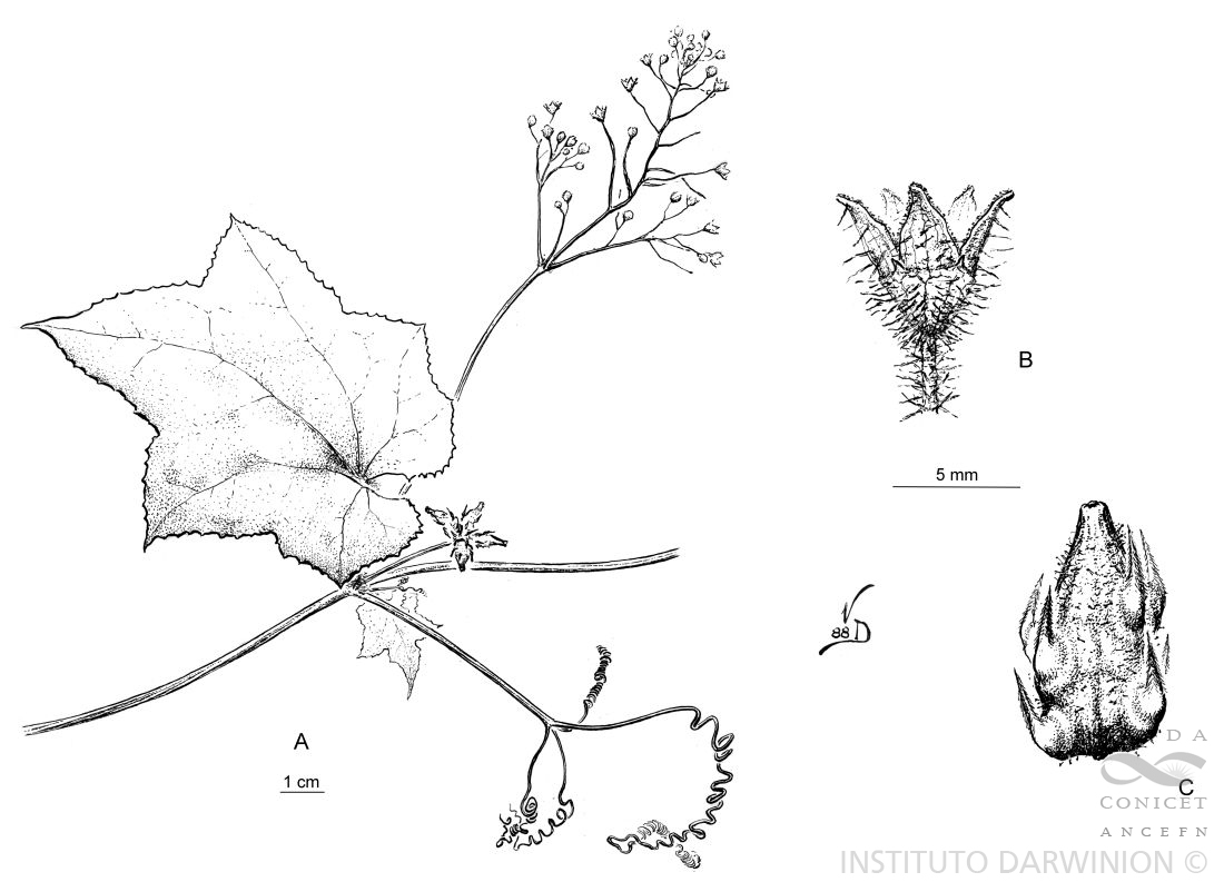 Terófitos zarcillosos con tallos plurimetrales. Hojas con pecíolos de 4-16 cm de largo; láminas suborbiculares, 5-7-anguladas o levemente 5-lobadas, ápice acuminado, margen aserrado o con dientes remotos, membranáceas. Zarcillos 4-5-fidos (3-fidos en el ápice de las ramas). Monocasios estaminados racemiformes, simples o compuestos, de 9-30 cm de largo. Flores estaminadas con hipanto campanulado u obcónico; sépalos de 0,6-0,8 mm de largo; pétalos de 3-4,5 × 2-2,5 mm, blanco-verdosos; columna filamentaria de 1,5- 2,5 mm de largo; sinantéreo de 2 mm de largo. Flores carpeladas subsésiles, en glomérulos 3-15-floros; pedúnculos de 2-5 cm de largo; ovario fusiforme, de 1,5 mm de largo; pétalos de 1,5 × 1 mm. Aquenios ovoideos, de 8-12 × 4-5 × 2-3 mm, glabros o pubérulos, verdoso-amarillentos, levemente 3-4-angulados, transversalmente rugosos, con 3-20 espinas, en su mayoría basales, piloso-retrorsas, adpresas, de 2-9 mm de largo. Semillas castaño-amarillentas.