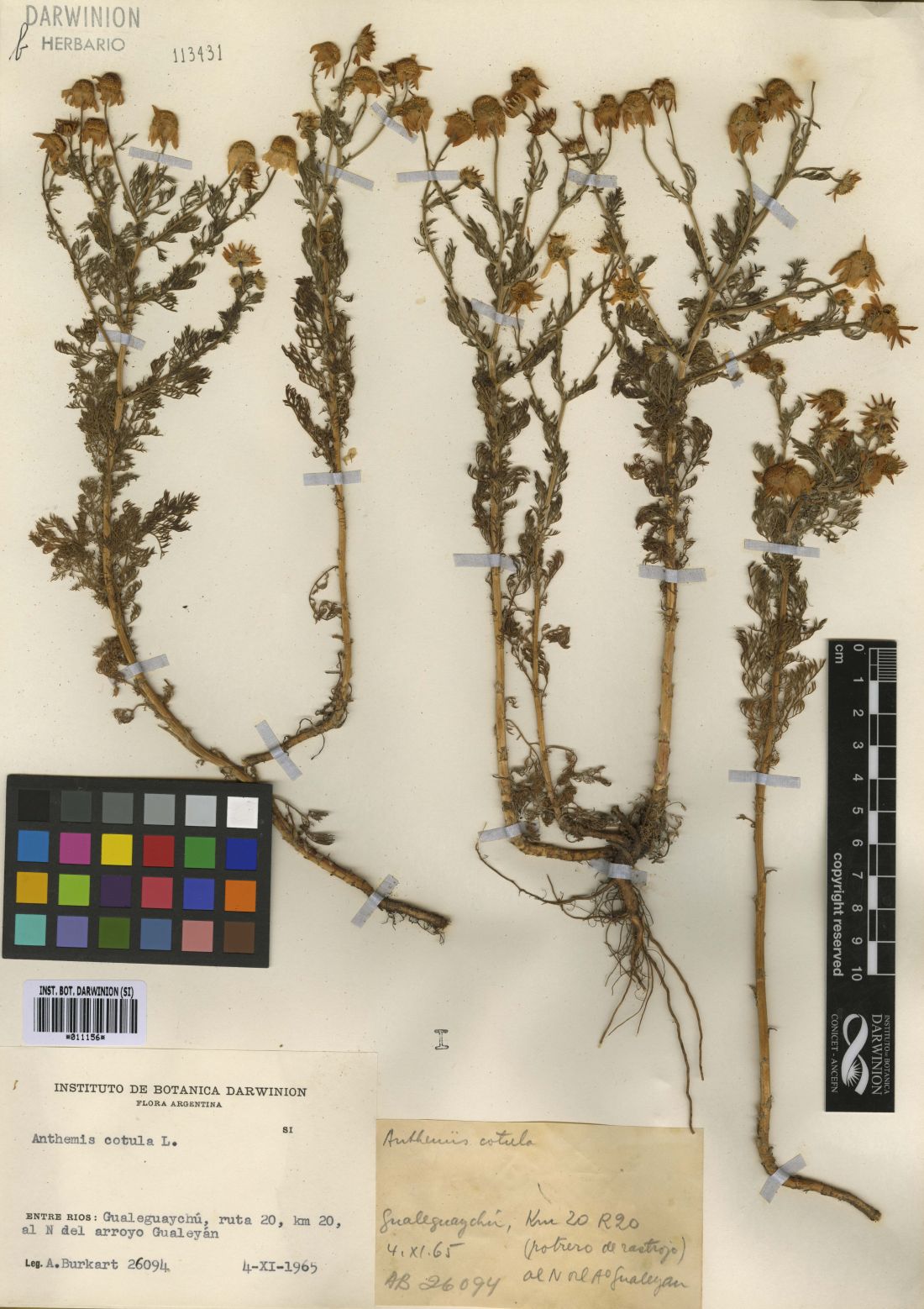 Hierbas anuales, aromáticas, escasamente pubescentes, ramosas desde abajo, de 15-50 cm de alto, fétidas. Hojas de contorno obovado, de 15-60 × 5-30 mm, 2-3-pinnatisectas, lóbulos linear-lanceolados, mucronados (raquis y segmentos angostos). Capítulos radiados sobre pedúnculos delgados. Involucro de 2-3 × 5-9 mm; filarios 3-seriados, ovado-lanceolados, laxamente pubescentes, margen escarioso y nervadura central obscura. Receptáculo cónico con páleas linear-subuladas sólo en las flores internas. Flores dimorfas: las del margen neutras, lígulas blancas, de 5-15 × 3-6 mm, tubos breves, alados; flores del centro perfectas, corolas tubulosas, de 2-2,5 mm de largo, amarillas. Aquenios obovoides o turbinados, oscuros, de 1-2,5 mm de largo, con 8-10 costillas granuloso-tuberculadas. Papus ausente.