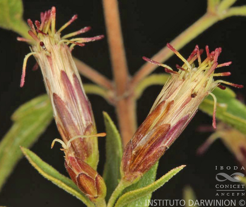Arbustos apoyantes de 1-2(3) m de alto, con ramas patentes, delgadas. Hojas pecioladas, láminas ovado-deltoides, de 5-7 × 2,5-4 cm, redondeadas o anchamente triangulares en la base, atenuadas y agudas superiormente, aserradas, glabras en ambas caras. Capítulos numerosos dispuestos en cimas corimbiformes axilares. Involucro cilíndrico de 6-7 × 1,5-2 mm; filarios 6-10, en 2- 3 series, los externos más cortos, oblongos, obtusos en el ápice, glabros y con 3-4 costillas en el dorso. Flores 3-5, corolas de 5- 6 mm de largo, blancas. Aquenios de 3-4 mm de largo, negros, pubérulo-glandulosos. Papus de color leonado.