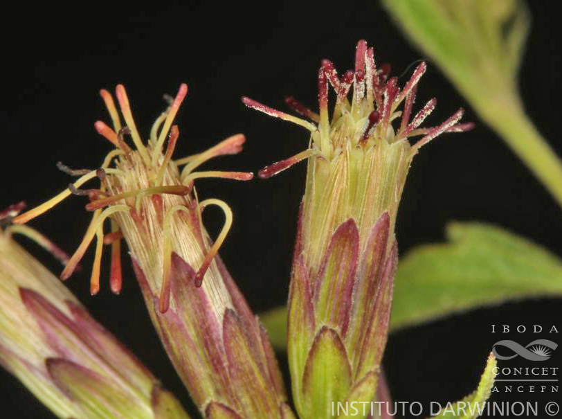 Arbustos apoyantes de 1-2(3) m de alto, con ramas patentes, delgadas. Hojas pecioladas, láminas ovado-deltoides, de 5-7 × 2,5-4 cm, redondeadas o anchamente triangulares en la base, atenuadas y agudas superiormente, aserradas, glabras en ambas caras. Capítulos numerosos dispuestos en cimas corimbiformes axilares. Involucro cilíndrico de 6-7 × 1,5-2 mm; filarios 6-10, en 2- 3 series, los externos más cortos, oblongos, obtusos en el ápice, glabros y con 3-4 costillas en el dorso. Flores 3-5, corolas de 5- 6 mm de largo, blancas. Aquenios de 3-4 mm de largo, negros, pubérulo-glandulosos. Papus de color leonado.