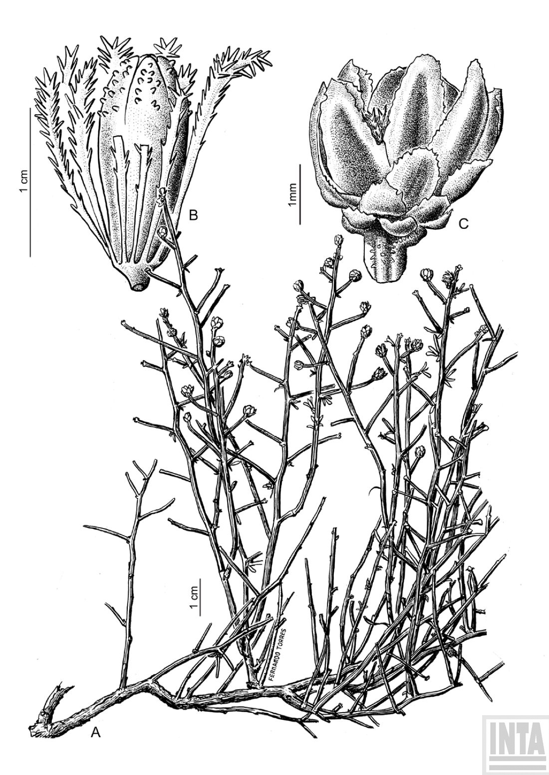 Sufrútices de 30-50 cm de alto, glutinosos, densamente revestidos por nidos pilosos, con ramas divaricadas. Hojas bracteiformes, inconspicuas. Capítulos mediana o largamente pedunculados (los superiores generalmente sésiles), reunidos en una sinflorescencia paniculiforme muy amplia. Capítulos pistilados con involucro cilíndrico de 7-9 × 2,5-3 mm; filarios en 4-5 series, obtusos o subagudos, los exteriores ovados, los intermedios elípticos o angostamente ovados y los interiores linear-oblongos. Flores 6-12; corolas de 5-6,1 mm de largo, de ápice irregularmente denticulado. Aquenios de 2,5-3,6 mm de largo, 10-costados, glabros. Papus 2-seriado, acrescente. Capítulos estaminados con involucro acampanado de 4 × 4 mm; filarios en 2-3 series, obtusos, los exteriores ovados y los interiores elíptico-oblongos. Flores 10-17; corolas de 3,2-4 mm de largo; estilo con ramas cortas pero separadas. Papus con cerdas denticuladas en el ápice.