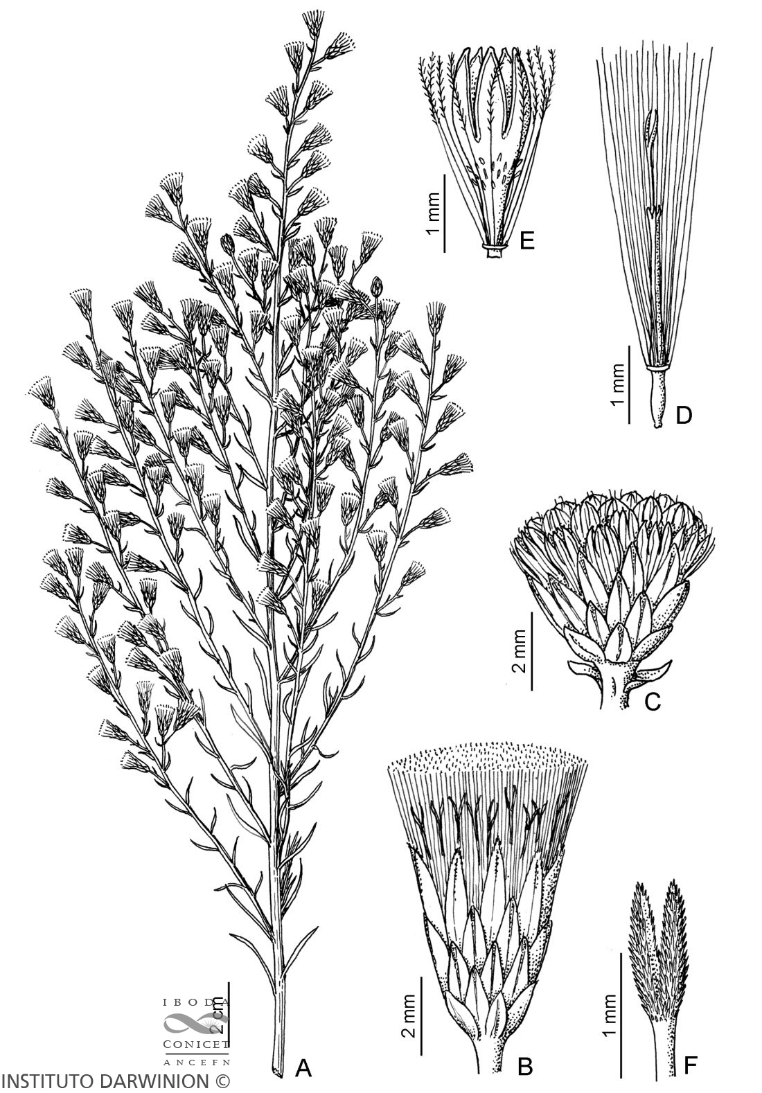 Arbustos de 1,5-2 m de alto, revestidos por nidos pilosos. Hojas lineares, de 0,8-3 cm × 0,5-1 mm, agudas en el ápice, enteras en el margen, en apariencia 1-nervadas. Capítulos pedunculados, dispuestos en sinflorescencias paniculiformes muy amplias. Capítulos pistilados con involucro acampanado de 3-4 × 3-4 mm; filarios en 4-5 series, agudos, los exteriores ovados y los interiores angostamente ovados a lineares. Flores 47-52; corolas de 2,8-3 mm de largo, denticuladas en el ápice. Aquenios de 1,1- 1,2 mm de largo, 5-costados, glabros. Papus 1-seriado, rojizo, acrescente. Capítulos estaminados con involucro acampanado de 2-3 × 2-3 mm; filarios en 2-3 series, semejantes a los pistilados. Flores 18-28; corolas de 1,2-3,8 mm de largo; ramas del estilo cortas pero separadas. Papus con cerdas levemente ensanchadas en el ápice.