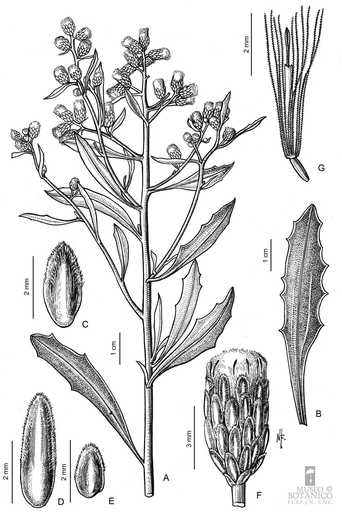 A. Rama florífera. B. Hoja. C-E. Filarios mediano, interior y exterior respectivamente del involucro de un capítulo pistilado. F. Capítulo pistilado. G. Flor pistilada.