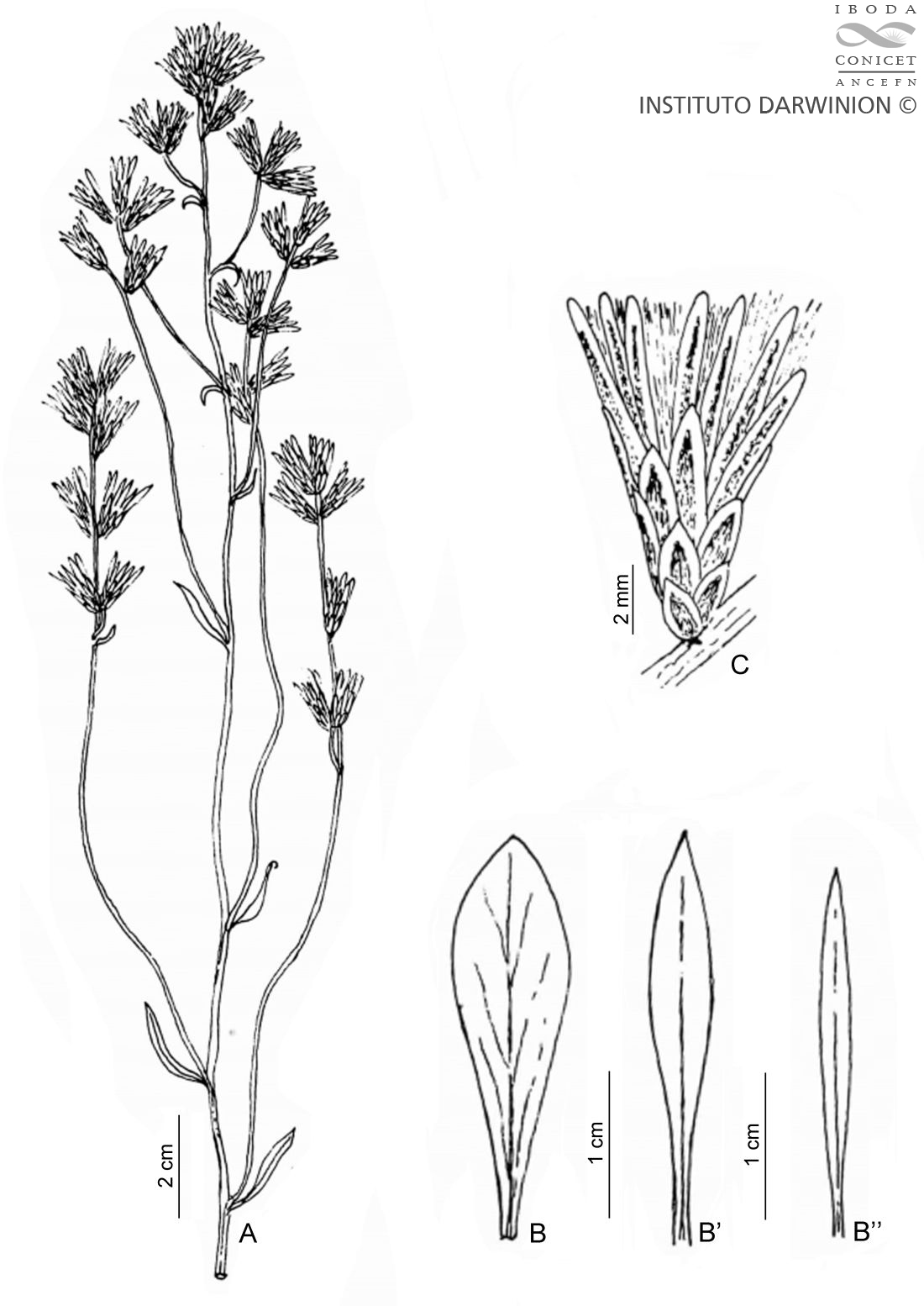 A. Rama florífera. B-B’’. Hojas. C. Capítulo pistilado. Tomado de Revista Fac. Agron. U.N. La Pampa 1:52, fig. 7. 1985.