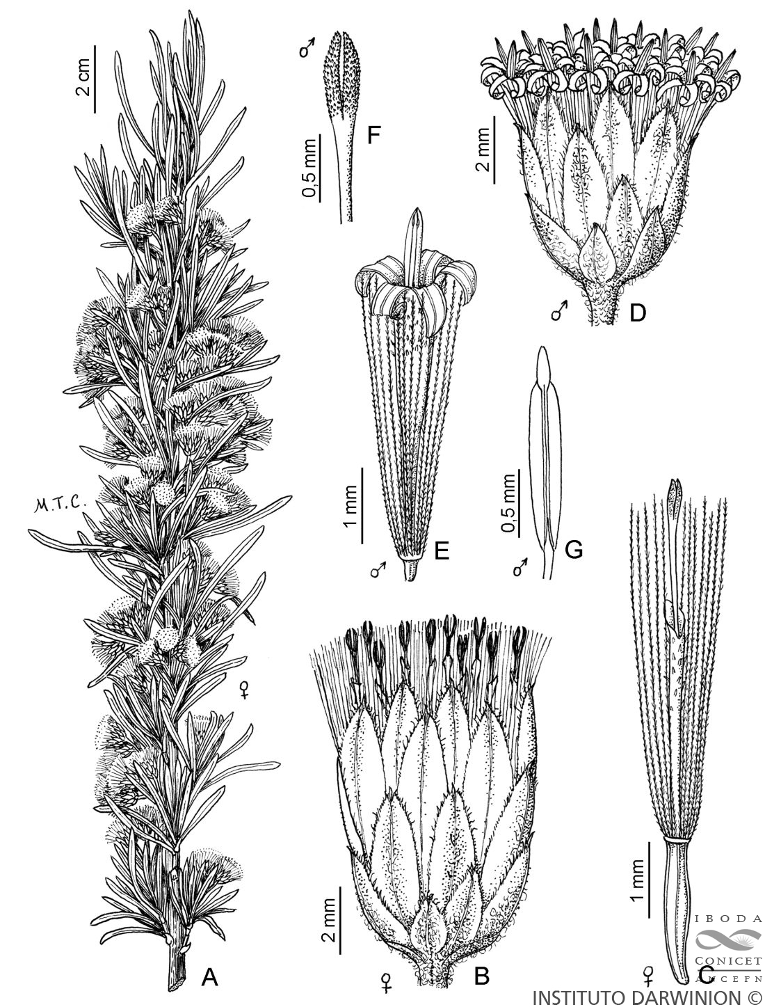 Arbustos de 0,6-2 m de alto, tomentulosos. Ramas largas, de cuyos nudos nacen ramas muy breves (braquiblastos). Hojas alternas (en los braquiblastos con entrenudos brevísimos), lineares o angostamente obovadas, de 1,5-3(-5) cm × 0,5-2 mm, obtusas o subagudas en el ápice, enteras y revolutas en el margen, en apariencia 1-nervadas, discoloras, glabrescentes en la haz y albo o griseotomentosas en el envés. Capítulos pedunculados, ordenados en corimbos foliosos en el ápice de los braquiblastos, formando en conjunto una sinflorescencia paniculiforme cilíndrica densamente hojosa. Capítulos pistilados con involucro acampanado de 5-6 × 4 mm; filarios en 3-4 series, los exteriores ovados y agudos o subagudos, los interiores de angostamente ovados a linear-oblongos y obtusos. Flores 42- 46; corolas de 2,2-3,5 mm de largo, de ápice irregularmente denticulado o muy brevemente ligulado (lígula, cuando presente, de sólo 0,3-0,5 mm de largo). Aquenios leve o marcadamente comprimidos, de 1,5-2,5 mm de largo, 5-costados, ralamente pubérulos. Papus 1- o 2-seriado, apenas acrescente. Capítulos estaminados con involucro acampanado de 4-5 × 4 mm; filarios semejantes a los pistilados. Flores 24-36; corolas de 3-5 mm de largo; estilo con ramas largas y separadas. Papus con cerdas apenas o no ensanchadas en el ápice.