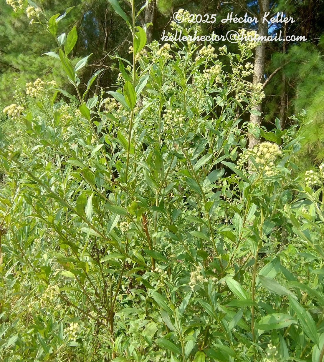 Arbustos de 1-3 m de alto, revestidos por nidos pilosos. Hojas pecioladas (pecíolos de 5-13 mm de largo), angostamente ovadas, de 4-11 × 1-2,5 cm, cortamente atenuadas en la base y largamente atenuadas en el ápice, aserradas en el margen, 3- nervadas. Capítulos pedunculados, dispuestos en corimbos agrupados en racimos o panículas, que se asientan en la axila de las hojas a lo largo de las ramas. Capítulos pistilados con involucro acampanado de 3-4 × 3-5 mm; filarios en 2-3 series, angostamente ovados a lineares, agudos o subagudos. Flores 50-58; corolas de 1,7-2,5 mm de largo, de ápice truncado. Aquenios de 0,7-0,9 mm de largo, 5-costados, con pelos largos, dispersos. Papus 1-seriado, apenas acrescente. Capítulos estaminados con involucro y filarios semejantes a los pistilados. Flores 14-26; corolas de 3-3,6 mm de largo; ramas del estilo largas y separadas. Papus con cerdas no ensanchadas en el ápice.