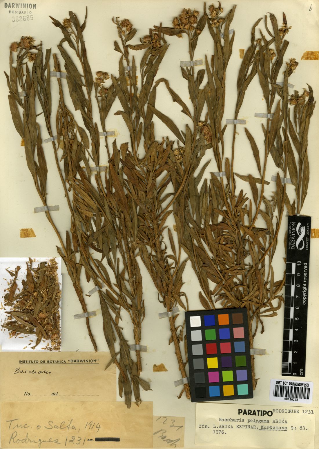 Arbustos polígamo-dioicos ca. 1,5 m de alto, tomentosos en las partes jóvenes. Hojas sésiles, angostamente ovadas, de 3-8 cm × 4-8(-10) mm, atenuadas en la base, agudas o subobtusas en el ápice, enteras en el margen (a veces con algunos dientes pequeños), oscuramente 3-nervadas (la nervadura media más notoria), en ocasiones tomentulosas en el envés. Capítulos pedunculados, dispuestos en corimbos compuestos paucicéfalos terminales. Capítulos pistilados con involucro acampanado de 5-6 × 3-4 mm; filarios en 4 series, los exteriores ovados y agudos o subobtusos, los interiores oblongos y obtusos. Flores 30-60; corolas de 2-2,5 mm de largo, de ápice truncado. Aquenios ca. 1,2 mm de largo, 5-10-costados, laxamente pubérulos. Papus 1- seriado, apenas acrescente. Capítulos heterógamos con cerca de 2 hileras de flores pistiladas marginales y numerosas (ca. 70) flores estaminadas centrales. Involucro acampanado de 5 × 5-6 mm; filarios en 4 series, los exteriores ovados y agudos o subobtusos, los interiores angostamente ovados y agudos. Flores estaminadas con corolas ca. 5 mm de largo; ramas del estilo largas y separadas. Papus con cerdas no ensanchadas en el ápice.