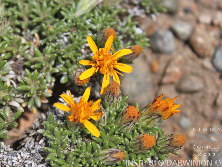 Arbustos en cojines bajos y compactos, de 4-6 cm de alto; ramitas densamente hojosas, tomentosas. Hojas alternas, linearlanceoladas, de 5-10 × 1 mm, cortamente envainadoras, subobtusas en el ápice, enteras y notablemente revolutas en el margen, coriáceas, glabras en la cara superior y tomentosas en la inferior. Capítulos solitarios, sésiles o cortamente pedunculados en el extremo de las ramitas. Involucro acampanado, de 6-8 × 6-7 mm; filarios 3-seriados, los externos gradualmente más cortos, lanceolados, agudos y tomentosos en el dorso. Flores con corolas amarillas, las del margen pistiladas, con corolas bilabiadoliguladas, con labio externo liguliforme, de 7-8 mm de largo, 3- dentado en el ápice y labio interno reducido a 2 segmentos enroscados; flores del centro perfectas, con corolas bilabiadas, labios iguales en su longitud, el externo 3-lobado y el interno 2- secto. Aquenios cilindroides, ca. 3 mm de largo (inmaduros), cortamente pubescentes. Papus blancuzco, formado por cerdas escabrosas de 10-11 mm de largo.