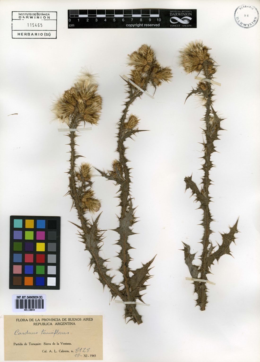 Hierbas anuales o bienales de hasta 1,20 m de alt. Tallos con alas dentadoespinosas. Hojas sésiles, base decurrente, oblongo-lanceoladas, margen con lóbulos espinosos, levemente discolores, indumento lanoso, laxo en el haz y más denso en el envés. Capítulos sésiles, agrupados a corto número en el extremo de las ramitas. Involucro cilíndricoacampanado; filarios lanceolados, acuminados, los medianos e internos con margen escarioso, glabros o algo lanuginosos en el dorso. Corola tubulosa, 5-secta. Aquenios elipsoidales, levemente comprimidos, glabros, lustrosos, con rayas obscuras longitudinales.