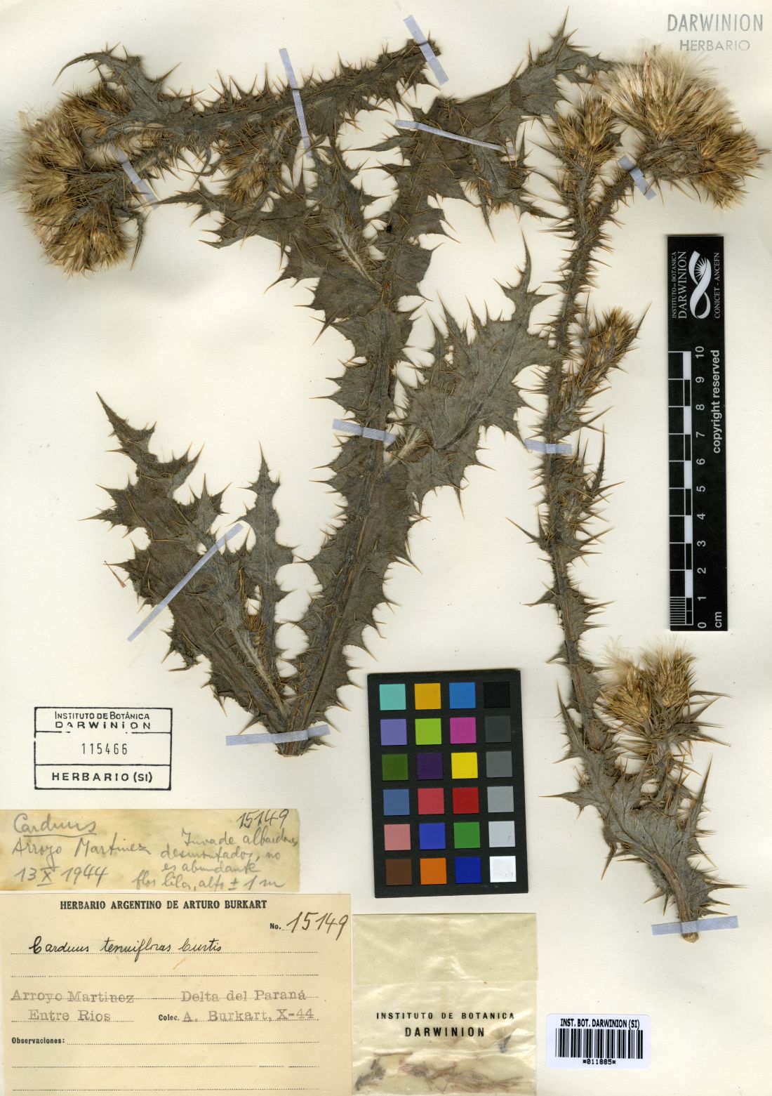 Hierbas anuales o bienales de hasta 1,20 m de alt. Tallos con alas dentadoespinosas. Hojas sésiles, base decurrente, oblongo-lanceoladas, margen con lóbulos espinosos, levemente discolores, indumento lanoso, laxo en el haz y más denso en el envés. Capítulos sésiles, agrupados a corto número en el extremo de las ramitas. Involucro cilíndricoacampanado; filarios lanceolados, acuminados, los medianos e internos con margen escarioso, glabros o algo lanuginosos en el dorso. Corola tubulosa, 5-secta. Aquenios elipsoidales, levemente comprimidos, glabros, lustrosos, con rayas obscuras longitudinales.