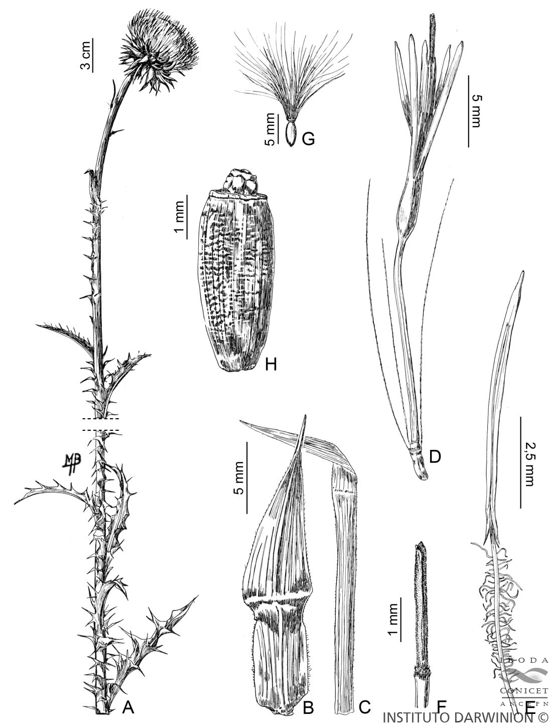 A. Rama florífera. B. Filario externo. C. Filario interno. D. Flor con algunos pelos del papus. E. Estambres. F. Estilo (parte superior). G. Aquenio y papus. H. Aquenio.