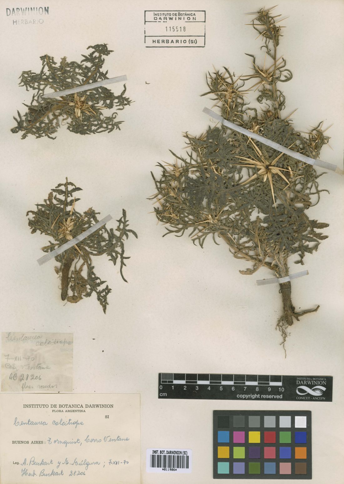 Hierbas anuales o bienales, hasta de 50(-80) cm de alto, muy ramificadas, con tallos divaricados, costados, glabrescentes, a veces acaules. Hojas basales arrosetadas, pecíolos de inconspícuos hasta de 3 cm de largo, láminas de contorno obovado o elíptico, de 10-27 × 2-8 cm, profundamente pinnatisectas, con segmentos sésiles, lineares, elípticos u ovados, hasta de 6 cm de largo, margen serrulado, en las hojas mayores partidos, ápice agudo, laxa o densamente hirsutas; hojas superiores menores. Capítulos heterógamos y discoides, sésiles o subsésiles, solitarios, en el extremo de las ramas o axilas de ramificaciones. Involucro ovoide o algo cilíndrico, de 12-17 × 6-7 mm (sin considerar las espinas de los filarios), 4-5-seriado; filarios externos y medios coriáceos, con espina terminal, rígida, acanalada en la superficie interna y divergente, los externos anchamente ovados, de 4-5 × 3-4 mm, con espina de 1-4 mm de largo y, a veces, con 1-2 pares de pequeñas espinas en la base, de la espina principal, los medios ovados, de 5-8 × 4-5 mm, con espina de 2-3,5 cm de largo y con 2-3(-4) pares de espinas pequeñas en la base, los internos angostamente ovados u oblongos, ca. 13 × 2-4 mm, con apéndice apical membranáceo, orbicular y ápice obtuso, sin espina, todos glabros. Receptáculo plano, con numerosas cerdas, hasta de 1,3 cm de largo. Flores 20-35, dimorfas, las del margen neutras, con corolas ca. 1,8 cm de largo, purpúreas o rosadas y lóbulos ca. 6,5 mm de largo, las del centro fértiles, con corolas ca. 1,75 cm de largo, purpúreas o rosadas y lóbulos ca. 7 mm de largo. Aquenios obovoides, ca. 3 × 1,5-2 mm, algo comprimidos, amarillentos, lustrosos con manchas color castaño, glabros. Papus ausente.