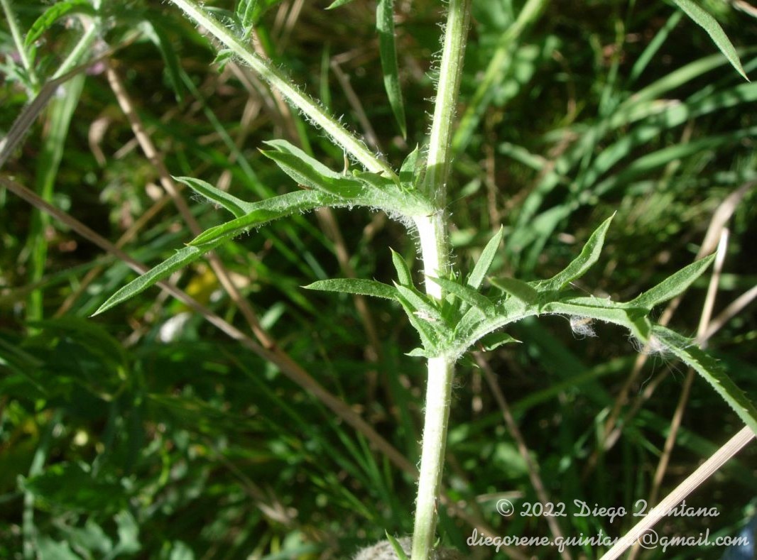 Hierbas anuales o bienales, hasta de 50(-80) cm de alto, muy ramificadas, con tallos divaricados, costados, glabrescentes, a veces acaules. Hojas basales arrosetadas, pecíolos de inconspícuos hasta de 3 cm de largo, láminas de contorno obovado o elíptico, de 10-27 × 2-8 cm, profundamente pinnatisectas, con segmentos sésiles, lineares, elípticos u ovados, hasta de 6 cm de largo, margen serrulado, en las hojas mayores partidos, ápice agudo, laxa o densamente hirsutas; hojas superiores menores. Capítulos heterógamos y discoides, sésiles o subsésiles, solitarios, en el extremo de las ramas o axilas de ramificaciones. Involucro ovoide o algo cilíndrico, de 12-17 × 6-7 mm (sin considerar las espinas de los filarios), 4-5-seriado; filarios externos y medios coriáceos, con espina terminal, rígida, acanalada en la superficie interna y divergente, los externos anchamente ovados, de 4-5 × 3-4 mm, con espina de 1-4 mm de largo y, a veces, con 1-2 pares de pequeñas espinas en la base, de la espina principal, los medios ovados, de 5-8 × 4-5 mm, con espina de 2-3,5 cm de largo y con 2-3(-4) pares de espinas pequeñas en la base, los internos angostamente ovados u oblongos, ca. 13 × 2-4 mm, con apéndice apical membranáceo, orbicular y ápice obtuso, sin espina, todos glabros. Receptáculo plano, con numerosas cerdas, hasta de 1,3 cm de largo. Flores 20-35, dimorfas, las del margen neutras, con corolas ca. 1,8 cm de largo, purpúreas o rosadas y lóbulos ca. 6,5 mm de largo, las del centro fértiles, con corolas ca. 1,75 cm de largo, purpúreas o rosadas y lóbulos ca. 7 mm de largo. Aquenios obovoides, ca. 3 × 1,5-2 mm, algo comprimidos, amarillentos, lustrosos con manchas color castaño, glabros. Papus ausente.